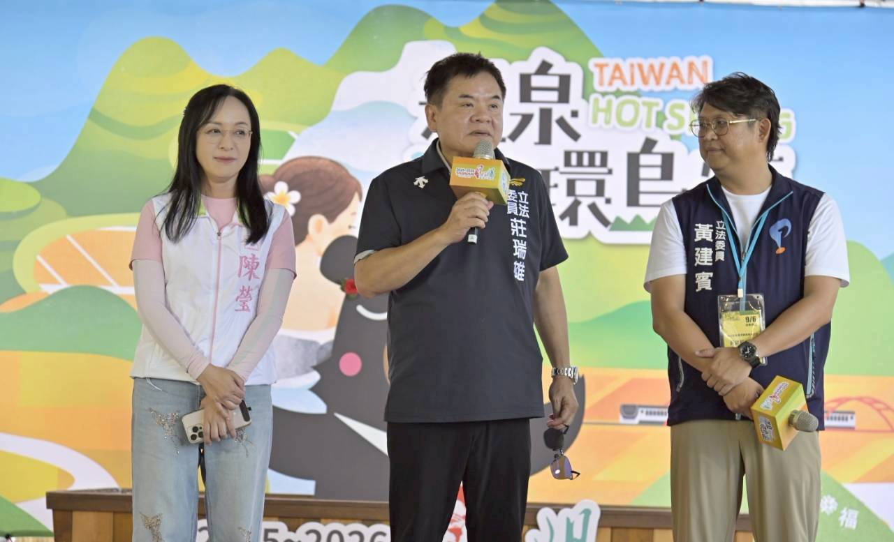 “5, 4, 3, 2, 1...” With Deputy Director-General of the Tourism Administration, Ministry of Transportation and Communications, Huang Shih-Fang; Legislator Chuang Jui-Hsiung; Legislator Huang Chien-Pin; Legislator Chen Ying; Chen Wei-Cheng, Director of Legislator Fu Kun-Chi’s Office; Huang Ching-Wen, Director of Legislator Lin Yi-Chun’s Office; Chen Sheng-Mei, Executive Director of Legislator Huang Jen’s Office; Bai Mo-Lin, Consular Affairs Assistant of the Manila Economic and Cultural Office Kaohsiung Branch; Yu Ming-Hsun, Director of the Tourism Department, Hualien County Government; Pu Min-Cheng, Director of the Transportation and Tourism Development Department, Taitung County Government; Li Hao-Wei, Chairman of the Hot Spring Tourism Association Taiwan; chairpersons of the 19 major hot spring regions across Taiwan; and representatives from the hot spring associations of Japan and Korea—pouring hot spring water into the bath bucket of “OhBear,” leader of the Tourism Administration’s Super Task Team—the seven-month-long “2025–2026 Taiwan Hot Springs—Hot Spring Island Tours” officially launched today at the Chihpen Century Hotel, Taitung.