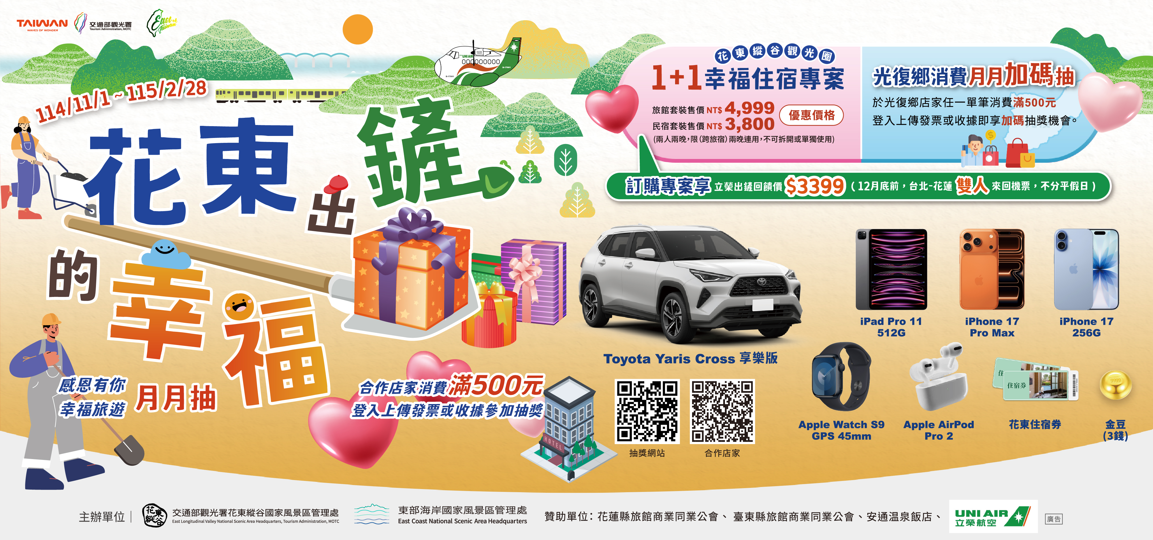 To make the journey even more exciting, the “Happiness from Hualien–Taitung! Thank You for Your Support! Monthly Lucky Draw” will be held concurrently. During the event period (November 1, 2025, to February 28, 2026), visitors who spend NT$500 or more at participating East of Taiwan partner businesses—covering dining, lodging, activities, shopping, and transport—can register their receipts to join the lucky draw; spending NT$1,000 or more doubles the chance of winning. Each month will feature prizes such as accommodation vouchers, electronic products, and Hualien–Taitung gift bundles. In addition, travelers who spend in Guangfu Township will be eligible for bonus draws, with a chance to win an iPhone 17 or a TaiSugar accommodation voucher. The grand finale “Happiness Award” will give away a Toyota Yaris Cross, gold beans, and many other exciting prizes—filling every journey with happiness and surprises.