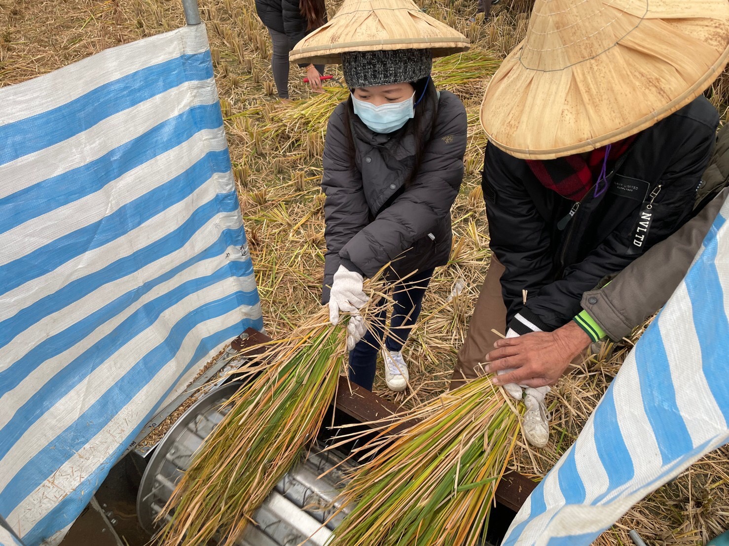イベントはパーカッションバンドBloco Forçaによるパフォーマンスで幕を開け、伝統的な習わしに従って、豊作を祈る爆竹が鳴らされ場を盛り上げました。来賓、市民がともに色とりどりの稲が植えられた田んぼに入り、カラフルなスカーフを振って色付きの稲に溶け込んだ様子を早送り動画で撮影。参加者全員がカラフルな稲の成長過程の一部分となり、「山からの贈り物」収穫前最後の大地の絵画を目に焼き付けました。会場では野外マーケットや手作り体験、ピエロのマジックバルーンショー、稲わら工芸コンテストなども同時開催。特にユニークな「収穫脱穀」体験では、田んぼアートの稲を栽培した農家が参加者を連れて田んぼに入り、手刈りや脱穀機での脱穀を体験できるイベントで、脱穀した籾は瓶に入れて持ち帰ることができるなど、子どもから大人まで楽しんでいました。