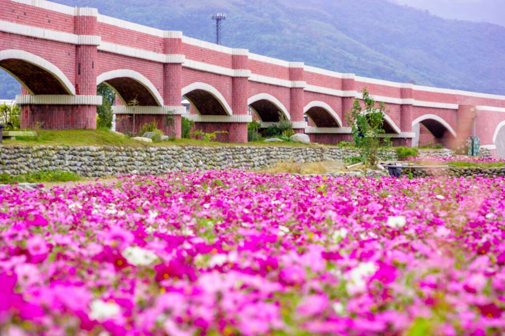 紅白のレンガで作られたアーチ型の「二層坪水橋」は見渡す限りのコスモス畑に囲まれており、クラシックな味わいのある絵のような美しさです。最近、台東で大人気の新しいお花見スポットです。