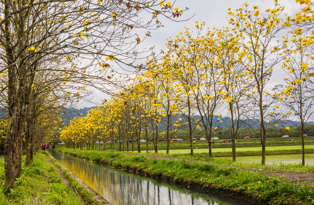 キバナノウゼンの花の見頃が訪れると、各地で花見の熱狂が繰り広げられます。光復と瑞穂の境界にある興泉圳では、3月にキバナノウゼンが黄金色の花を咲かせます。遠くに見える山々の緑を背景に、サラサラと水が流れる用水路に鮮やかな金色の花が映り、一幅の絵のような美しさ。近頃IGやFBで話題の人気スポットです。