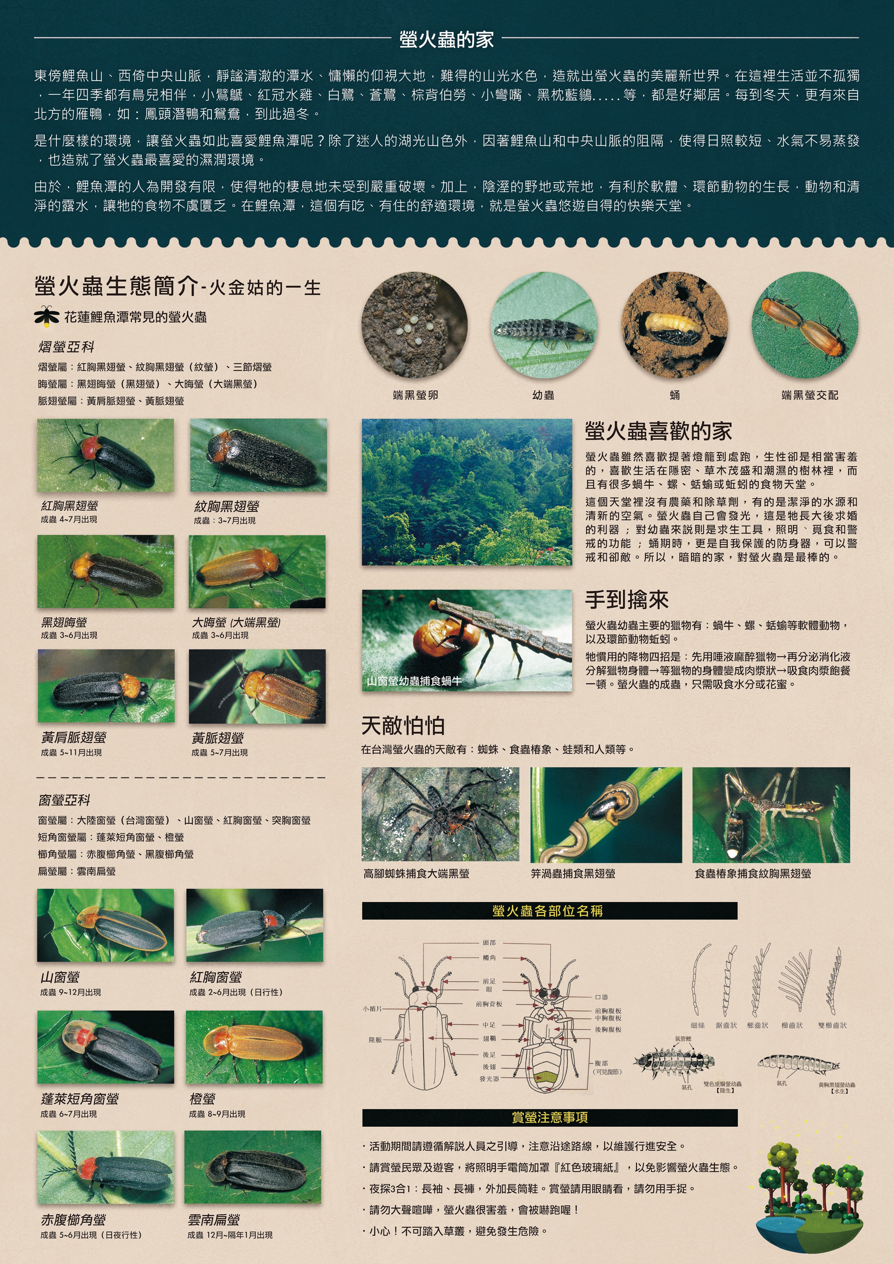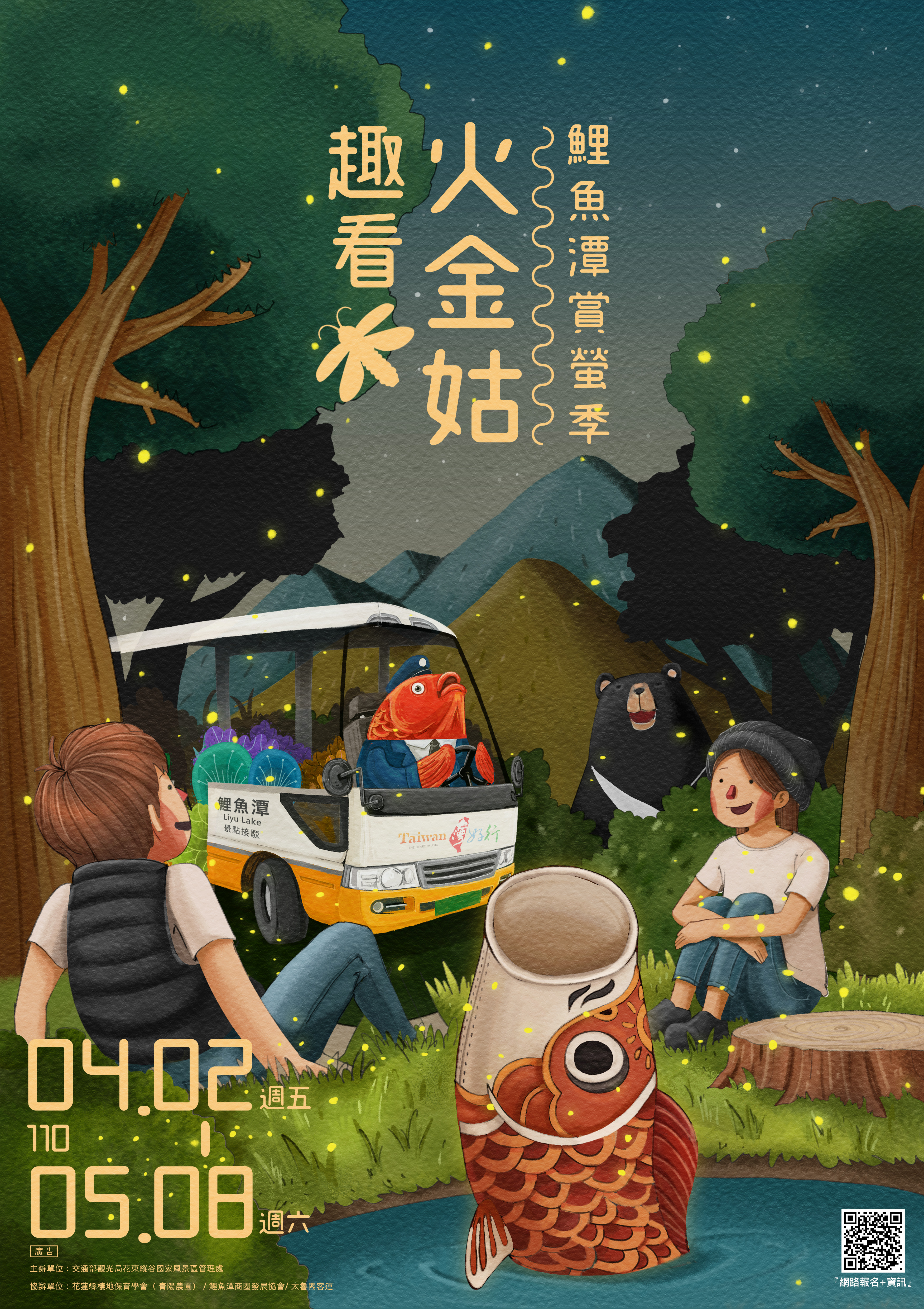 올해 교통부 관광국 화동종곡 국가풍경구 관리처(종관처)가 주최하는 '2021 리위탄 반딧불이 축제-반딧불이 보러 가자' 행사가 오는 4월 2일부터 5월 8일까지 매주 금요일과 토요일에 리위탄 휴양구에서 정식으로 막을 올린다. 리위탄 휴양구는 수질이 맑고 반딧불이의 서식지로 적합한 환경과 더불어 천혜의 기후를 갖추고 있어, 울창한 숲속에 수많은 '불꽃 팽이버섯(역주: 타이난 지역에서 반딧불이를 이르는 말)'이 반짝반짝 초록빛을 발하는 모습은 마치 '땅 위에 있는 은하수' 같다. 성충이 된 반딧불이가 내뿜는 빛은 짧은 생을 사는 이들이 짝을 찾고 번식하기 위한 신호로 사용된다. 반딧불이가 발하는 빛의 고유한 깜빡임은 그들의 짝을 이끌며, 그로 인해 리위탄은 해마다 4월과 5월이 되면 낭만적인 분위기로 가득 찬다. 종관처 궈전링 처장은 올해 반딧불이 해설 안내 코스는 전면 무료일 뿐만 아니라, 종관처의 전문 해설사들이 나서 시민 여러분께 별빛 하늘 아래에서 반딧불이의 생태를 가까이에서 관찰하고, 직접 밤의 리위탄 휴양구가 지닌 매력도 체험하며 가족, 친구들과 함께 반딧불이가 있는 고요하고 아늑한 시간을 보내실 수 있도록 할 것이라고 전했다. 또한, 올해 반딧불이 감상 행사는 타이완하오싱 종곡화롄 노선과 협업하여 4월 2일부터 매주 토요일 화롄 기차역에서 출발하는 '반딧불이 감상 특별 버스'를 운행할 예정이며, 온라인에서 반딧불이 특별 버스 묶음 티켓을 구입하면 보다 편안하게 행사 장소까지 이동할 수 있다고 밝혔다. 이외에도 티켓을 사용할 때 남겨진 반쪽을 반딧불이 행사 현장에 지참하면 선물 1개로 교환받을 수 있다. 선물에는 실용적인 종곡 한정 특색 테이블 매트, 미니 자석 외에도 화롄 지역 특산품인 '위리 양갱'과 'RaKoTo 레코드판 쿠키'가 포함돼 있다(선물 구성품 및 교환은 현장 상황에 따라 상이할 수 있음). 궈전링 처장은 야외에서 진행되는 행사이기는 하나, 신종 코로나바이러스(COVID-19) 감염증이 확산 중이므로 종관처는 참가 시민 모두의 안전을 위해 전자출입명부를 사용하고 행사 기간 동안 시설 관리를 엄격히 진행할 예정이며, 반딧불이 감상 구역에 입장하기 전 반드시 체온 측정과 손 소독에 협조하고 마스크를 착용해야 모두가 안전하고 즐거우며 잊지 못할 유익한 생태 여행을 즐길 수 있다고 당부했다. 이와 더불어 방문객에게는 자원봉사자와 관계자의 안내에 따라 관람하고, 개인의 안전을 위해 우산 사용과 굽이 높은 신발, 샌들 착용을 자제하며 반딧불이의 생태 활동에 영향을 주지 않도록 손전등에는 '붉은 셀로판지'를 덧붙여 줄 것을 부탁했다. '2021 리위탄 반딧불이 축제-반딧불이 보러 가자' 행사는 4월 2일부터 5월 8일까지 매주 금요일과 토요일 오후 7시와 8시에 각 1회 해설 안내를 시행한다. 회당 참가 가능 인원은 최대 300명이며 행사가 진행되는 주의 수요일 새벽 12시 정각에 온라인 신청을 마감한다. 학교, 단체 및 시민들의 많은 참여를 바란다.