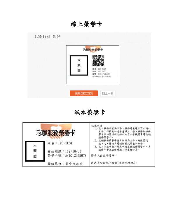 2️⃣紙本榮譽卡:請志願服務運用單位自行於衛生福利部志願服務資訊整合系統下載列印後提供志工使用。