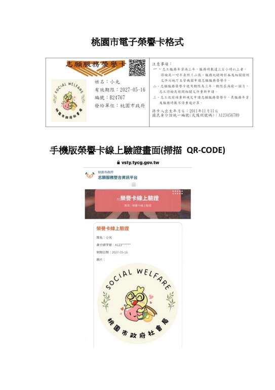 桃園市志願服務榮譽卡自108年4月1日起,即採線上申辦及核發電子榮譽卡,提供使用者自行下載列印,並可透過掃描卡面上之QR-code,連結至旨揭資訊平台,以線上驗證志工榮譽卡資訊,該資訊平台於113年1月1日改版上線,驗證網址(如下方相關連結)及驗證畫面同步更新,檢附該市電子榮譽卡格式及榮譽卡線上驗證畫面供參。
