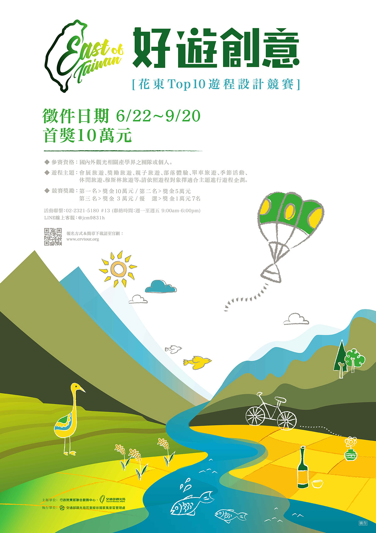 相關訊息請上本處官網https://www.erv-nsa.gov.tw/user/main.aspx,或逕洽承辦人員,「好遊創意 遊程競賽活動」企劃課高小姐03-8875306#626、「花東產業輔導暨參展規劃」遊憩課林小姐03-8875306#662