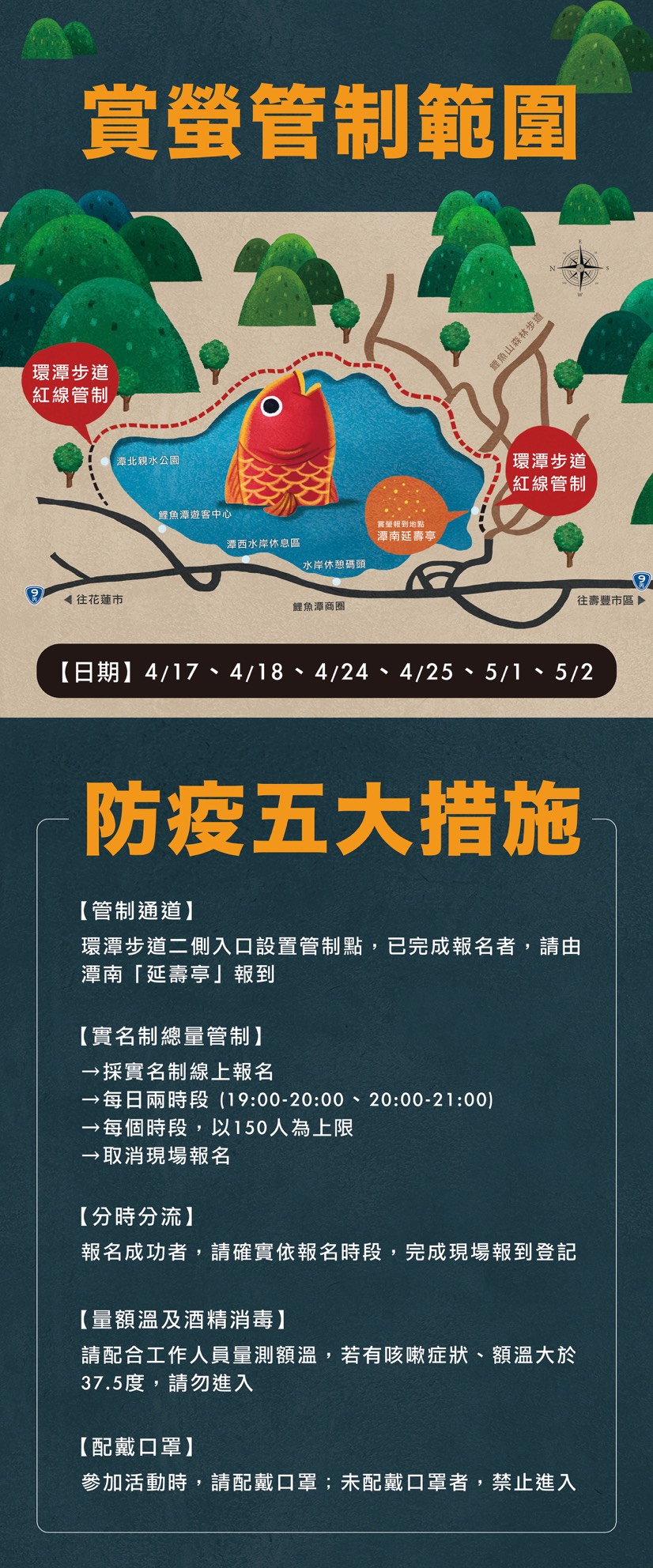 6.防疫措施:為因應嚴重特殊傳染性肺炎(COVID-19)疫情,賞螢活動期間將設置管制通道,進入營區前將由志工老師協助測量額溫及手部酒精消毒,也請遊客如有需要請自備口罩。