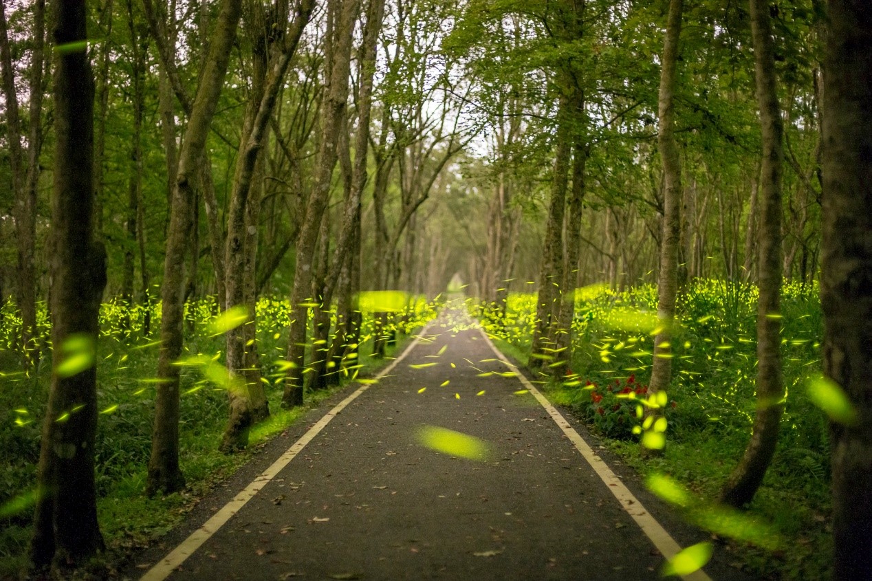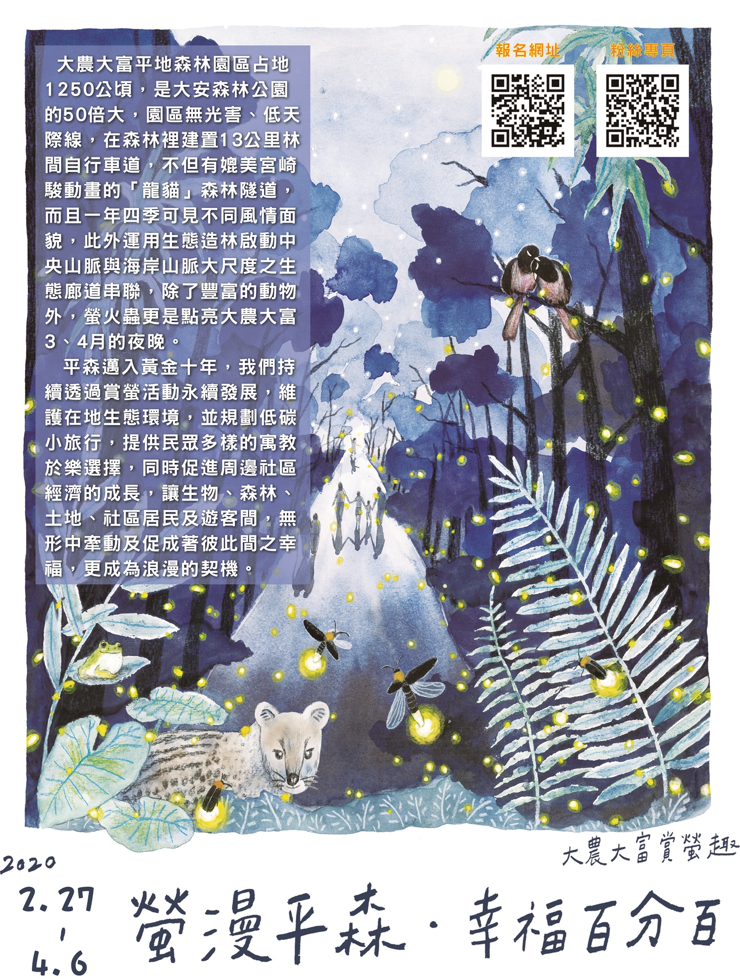 螢火蟲報到! 3月、4月的夜晚,歡迎到花蓮大農大富平地森林園區,園區有媲美宮崎駿動畫的「龍貓」森林隧道、生態廊道、13公里林間自行車道,除了可以見到多種動物,更有夏季主角螢火蟲來點亮夜晚。快來賞螢秘境來一趟幸福浪漫之旅,體驗螢光與在地之美!