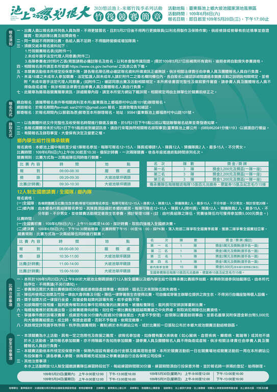 2020悠活池上米鄉竹筏季系列活動竹筏競賽冠軍獎金五萬元,競賽報名時間自即日起至109年5月20日(星期三)下午17時。詳細活動報名資訊請至池上鄉公所官方網站查詢(https://www.cs.gov.tw/home/index.php/news/2019-05-28-03-46-46/985-2020-3)。
