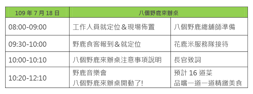 鹿野鄉擁有豐富的農特產,以及多元的社區部落文化,更有八個野鹿的社區營造成員長久在鹿野深耕,配合國際熱氣球嘉年華的舉辦,特別邀集社區合力在本鄉風景優美的武陵綠色隧道舉辦有質感的產地餐桌活動,邀請全國100位來賓前來鹿野,享用八個野鹿所提供的「花鹿米」農村風味餐。