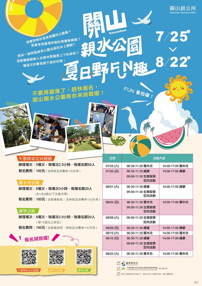 活動資訊活動日期 2020-07-18~2020-08-22地址 956 臺東縣關山鎮親水公園 訊息內容🎉FUN暑假就來關山親水公園🎉 在關山這座美麗的親水公園內, 想要享受盡情奔跑的尋寶樂趣嗎? 想來一趟乘風破浪、心靈成長的水上體驗? 想要體驗蜘蛛人在樹林間隨意上下的神奇? 讓這次的暑假留下美好回憶,不要猶豫❗️ 趕快報名,三種活動等你來挑戰 關山親水公園夏日野FUN趣系列活動 活動時間:109年7月18日至8月22日 活動地點:關山鎮 關山親水公園 點選以下報名網址 👉️獨木舟活動 👉️繩攀活動 👉️生態探索定向運動相關連結臺東縣關山鎮公所粉專台東縣關山人工濕地相關照片