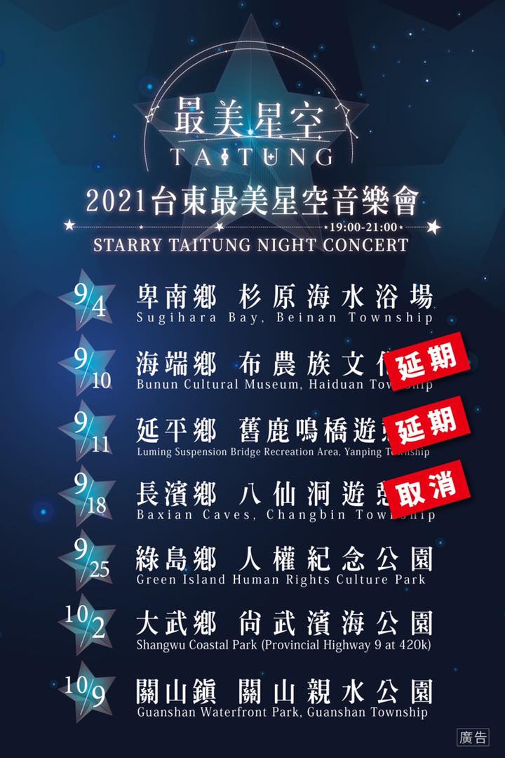長濱場次:9月18日(六) 地點:長濱鄉八仙洞遊憩區(配合中秋防疫政策取消)