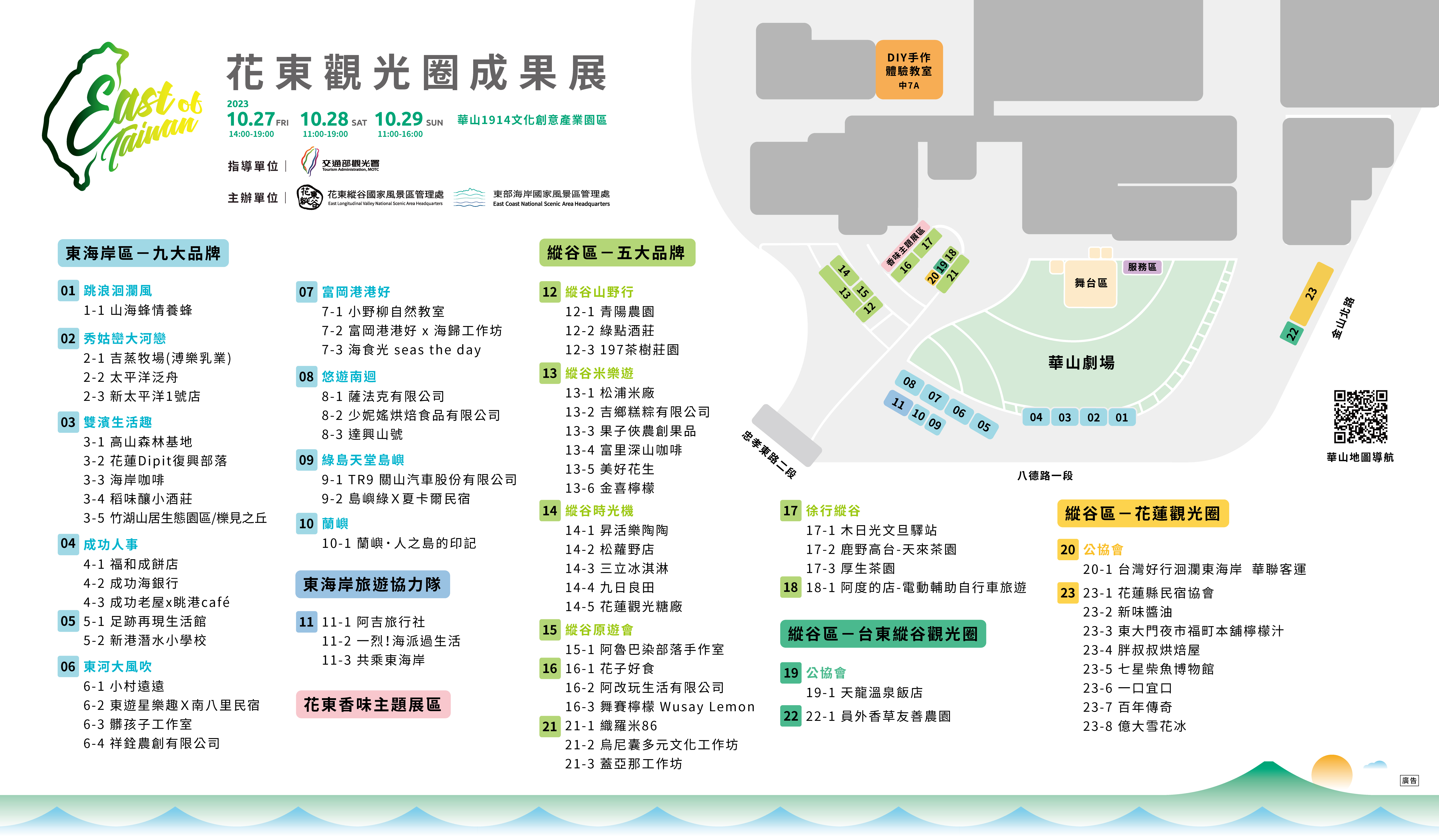 活動資訊活動日期 2023-10-27~2023-10-29地址 100 臺北市中正區八德路一段1號(臺北華山1914文化創意產業園區) 訊息內容由交通部觀光署花東縱谷國家風景區管理處(以下簡稱本處)及交通部觀光署東部海岸國家風景區管理處(以下簡稱東管處)合辦的第二屆「2023 East of Taiwan花東觀光圈成果展」,訂於10月27-29日在台北華山文創園區的劇場草地上盛大辦理。透過縱谷區5大特色主題及東海岸9個區域觀光圈品牌等主題,超過70家花東特色店家,將屬於花東在地的人文風情、職人藝術、美食餐桌、溫泉文化、伴手禮等,以產地直送方式提供最直接的花東觀光樂趣。 活動名稱: East of Taiwan花東觀光圈成果展 活動日期: 10月27日(五)~10月29日(日) 活動時間:🐾10月27日(五) 14:00-19:00 🐾10月28日(六) 11:00-19:00 🐾10月29日(日) 11:00-16:00 活動地點:臺北華山1914文化創意產業園區(100台北市中正區八德路一段1號) 活動資訊:⭐️漫行花東-香味主題沉浸手作體驗👈報名體驗,請點我😉體驗一:花草香-果子俠農創果品 體驗二:酒香-稻味釀 體驗三:米香-松浦米廠體驗四:植物精油香-祥銓農創 🎉超多現場限定好康 消費滿千抽好禮、每日摸彩、 聽故事、填問卷、分享貼文 通通都有機會獲得限量好禮🎉 相關照片