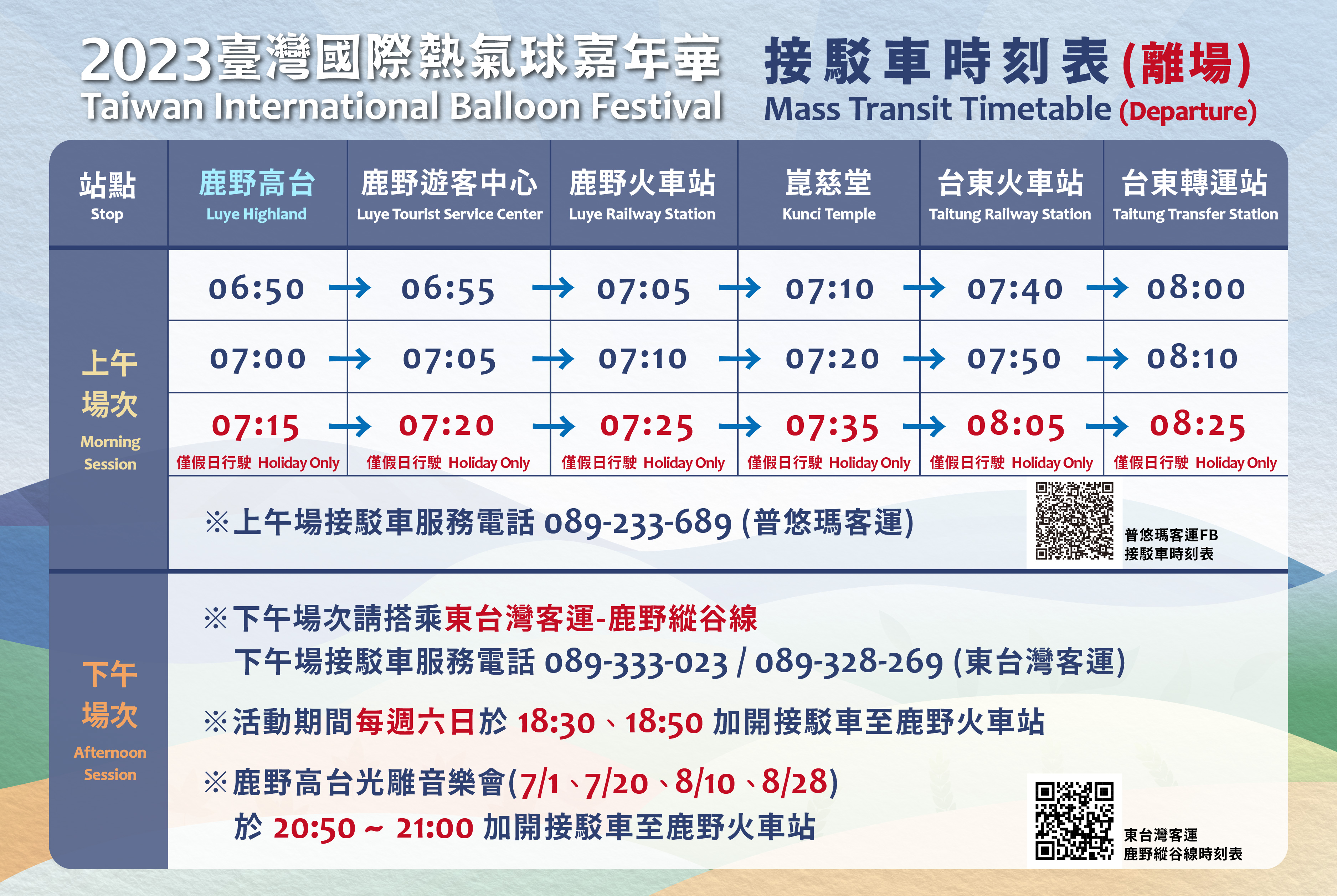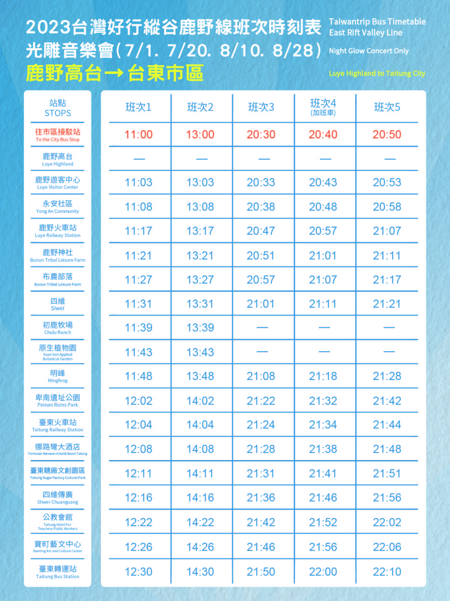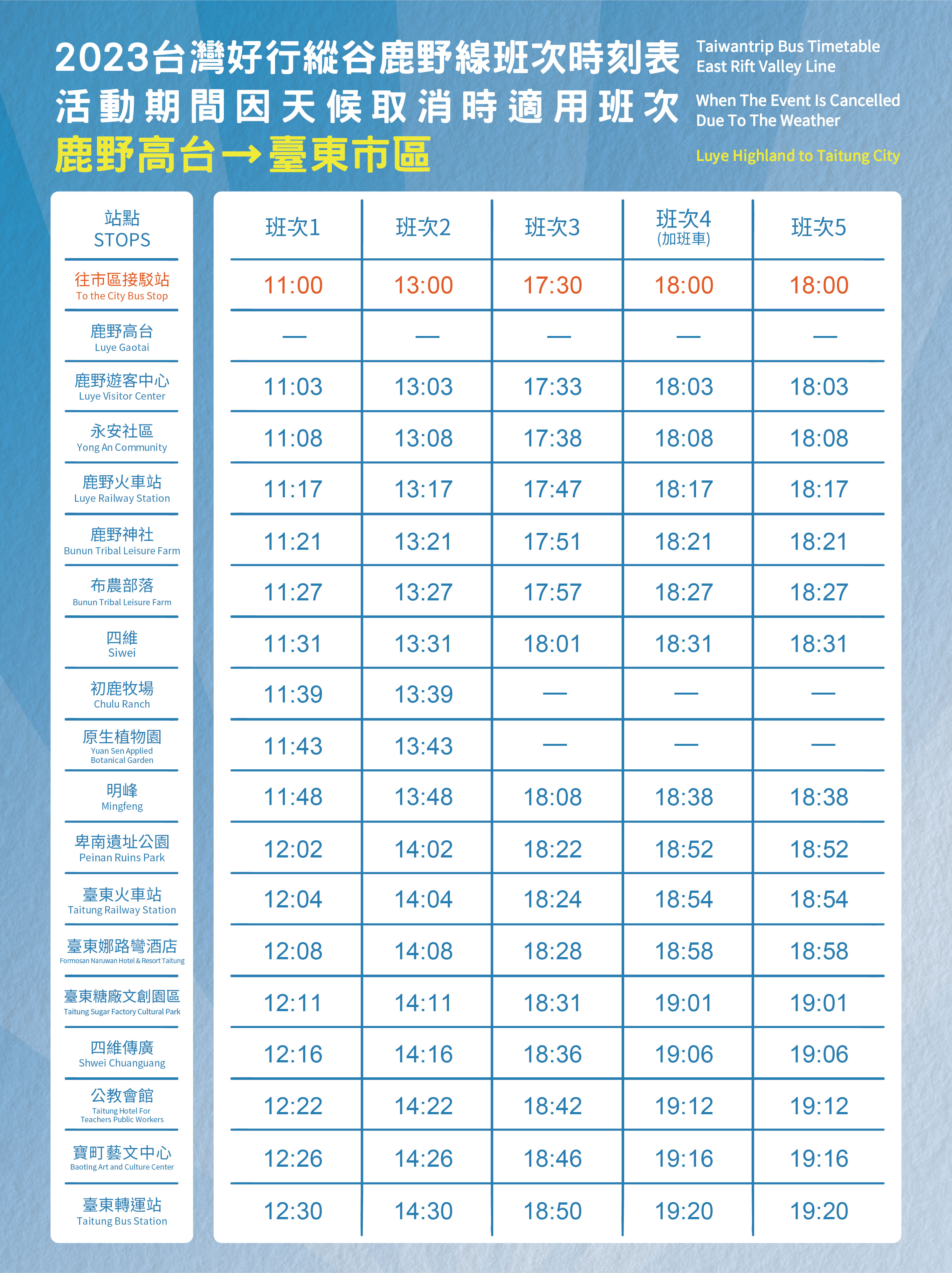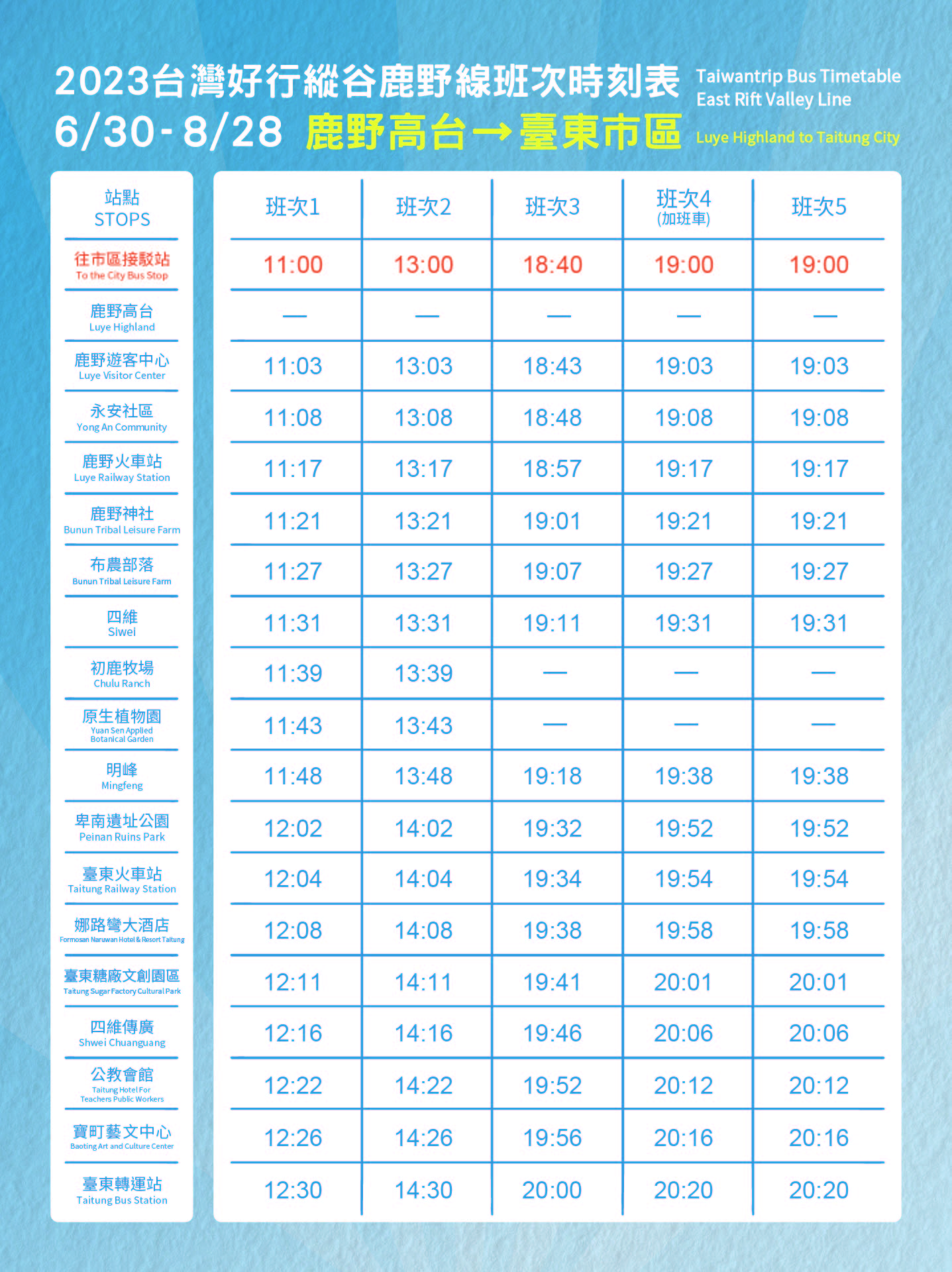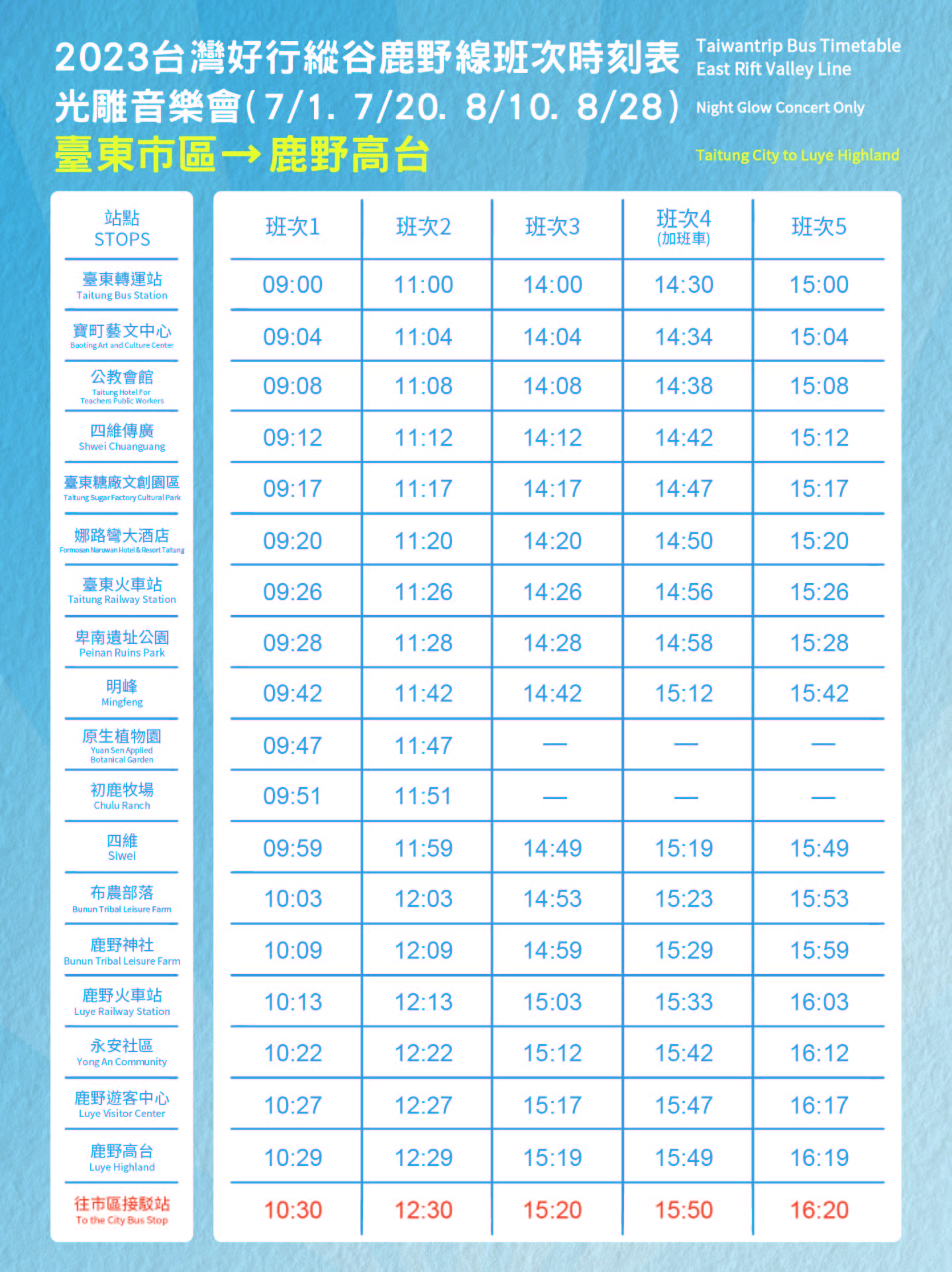 回程最晚07:00於鹿野高台「大客車接駁處」發車