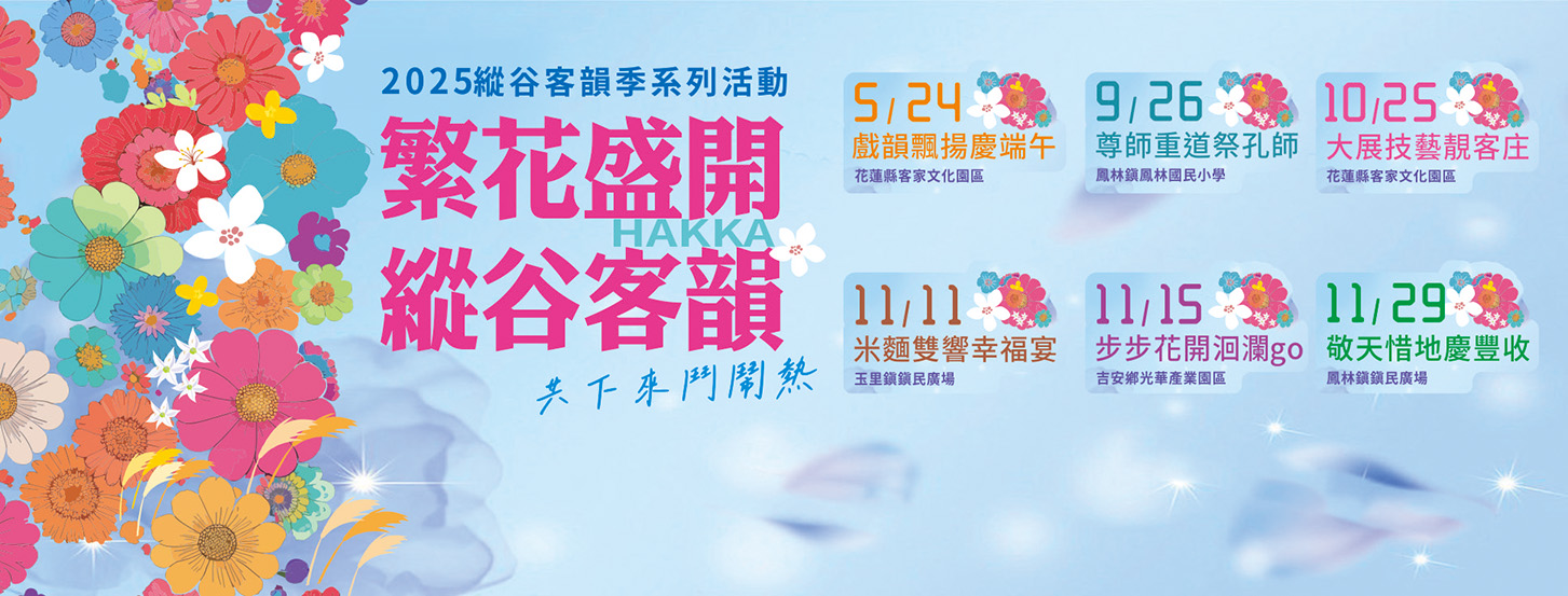 2025花蓮縱谷客韻季系列活動自5月展開,橫跨花蓮多個鄉鎮,規劃有客家大戲、客家市集、祭孔典禮、玉里麵節、健走活動及收冬戲等豐富內容,不同的場次有不同的展演,希望透過活動提升各地的文化能見度,讓大家來花蓮客庄旅遊。