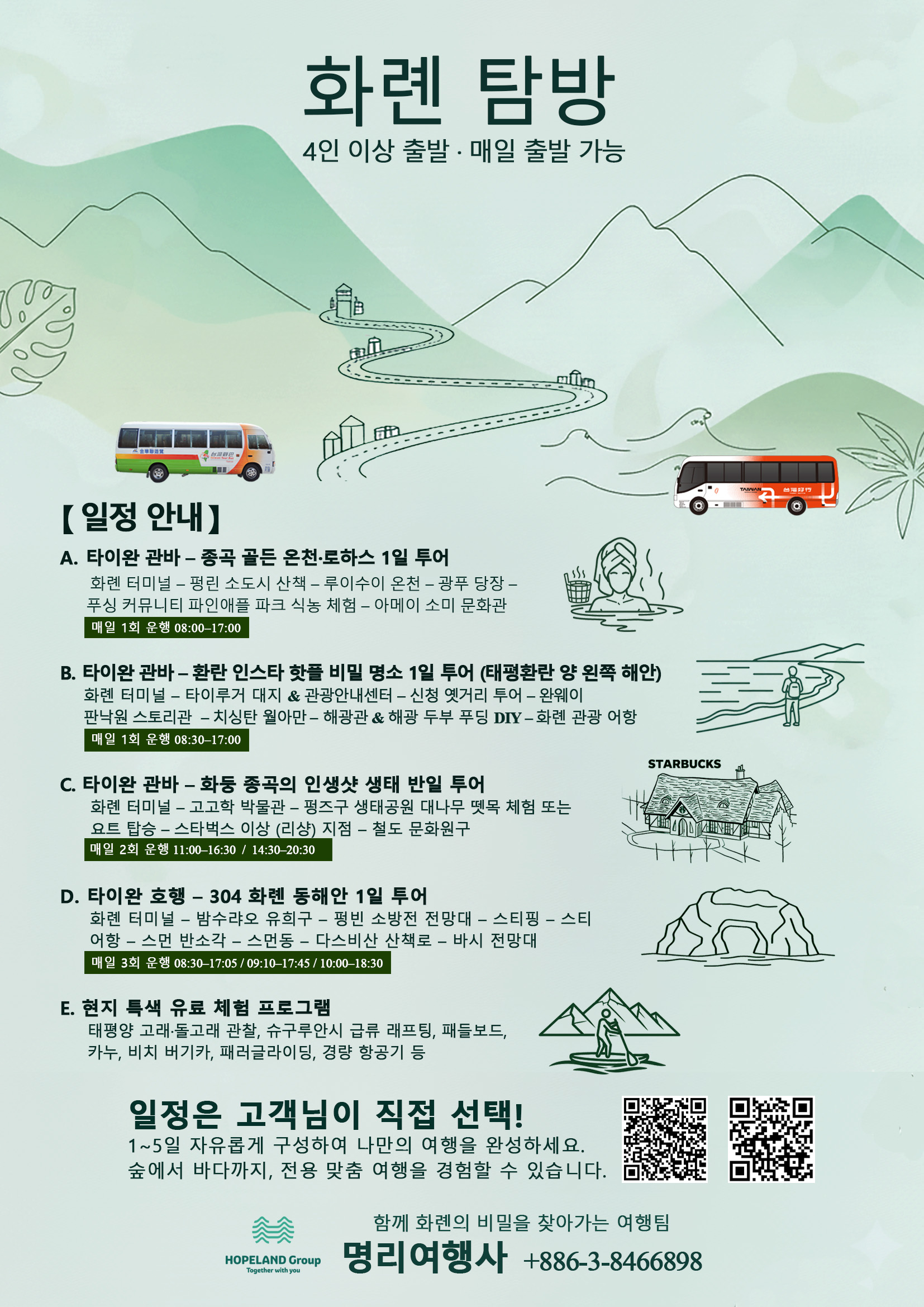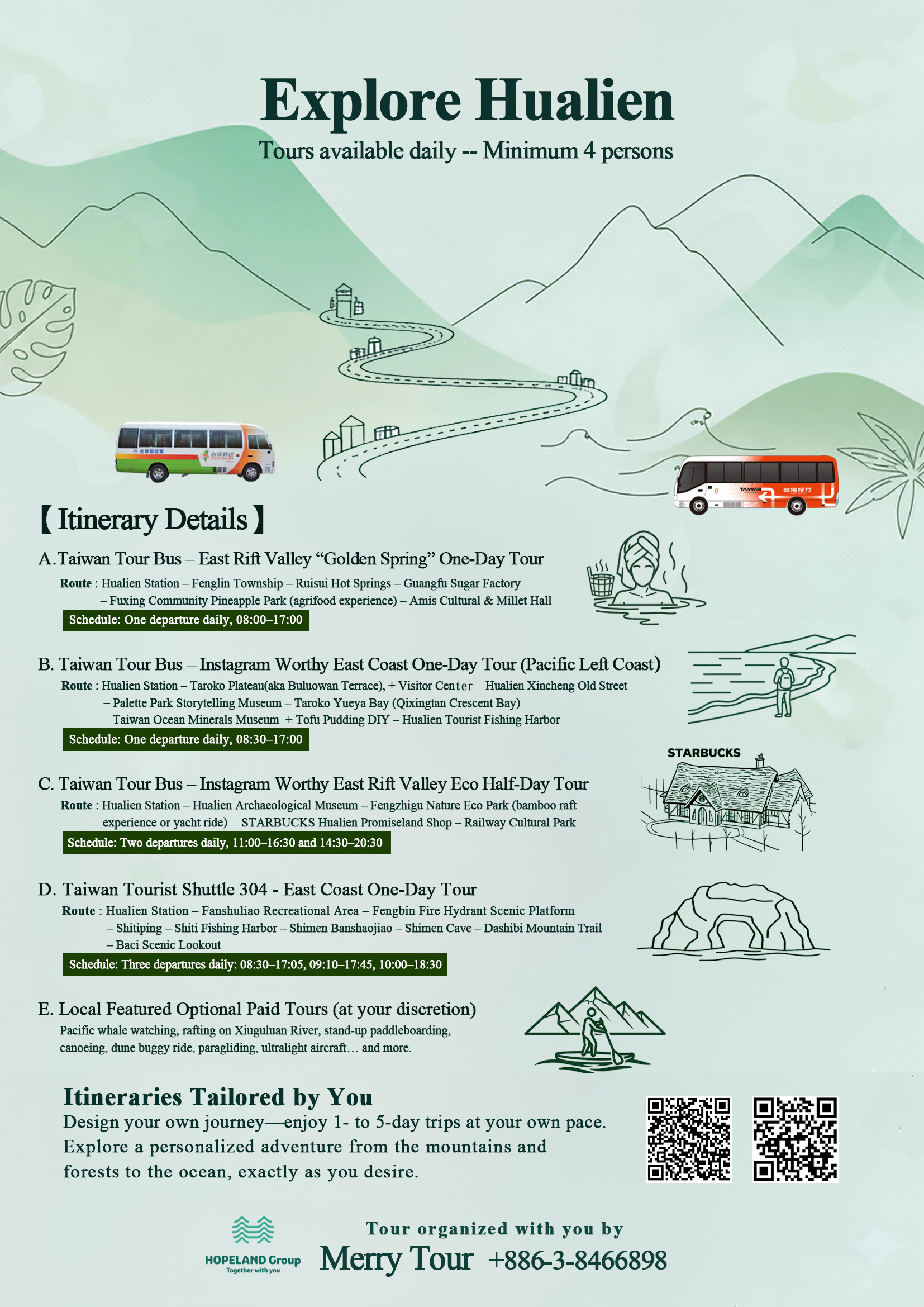 花建轉運站—太魯閣礙地+遊客中心—新城老街巡禮—玩味蕃樂園故事館—七星潭月牙灣—海礦館+海礦豆花DTY—花是觀光漁港|每日一班次 08:30-17:00