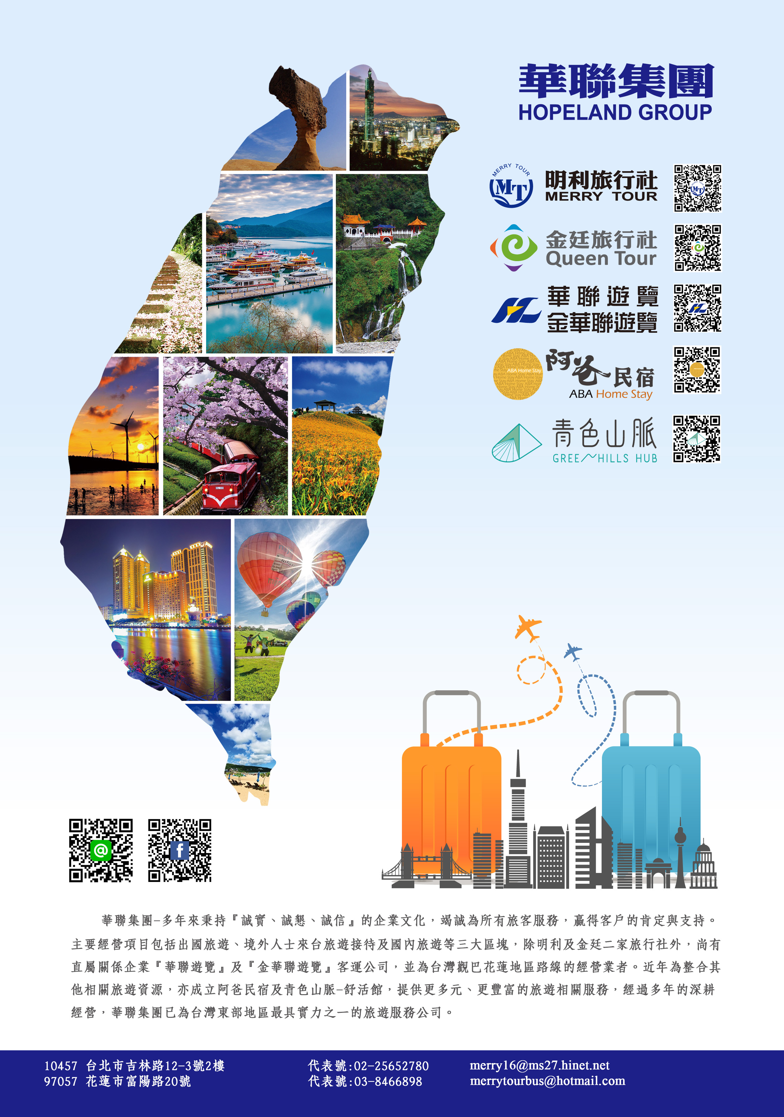 華聯集團以「誠實、誠懇、誠信」為核心,服務範疇涵蓋國內外旅遊及境外旅客來台接待,並經營台灣觀巴花蓮路線。旗下包含旅行社、遊覽車公司及民宿、休閒館等事業,提供多元旅遊選擇,為東部具代表性的旅遊服務企業之一。