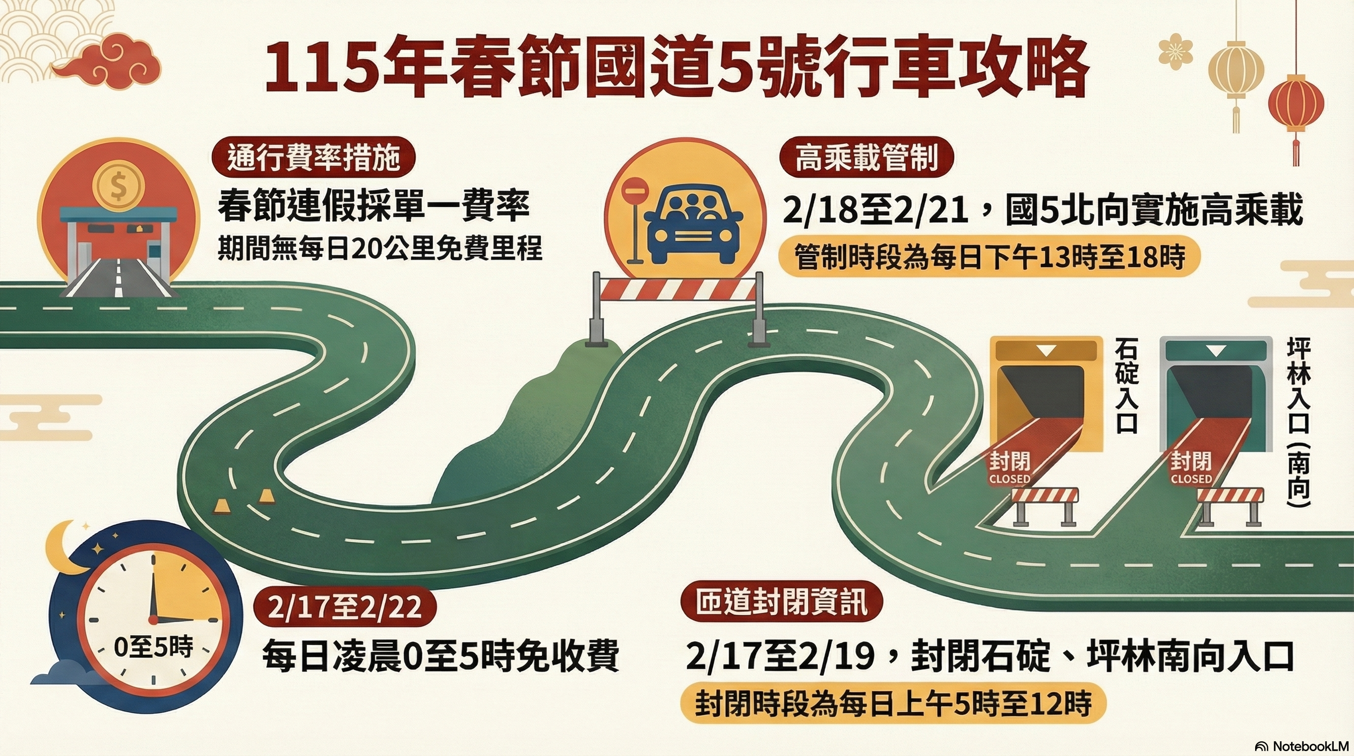 - 國道通行費率資訊:春節連假(2/14-2/22)採單一費率,無20公里免費,2/17~22 每日0至5時暫停收費。