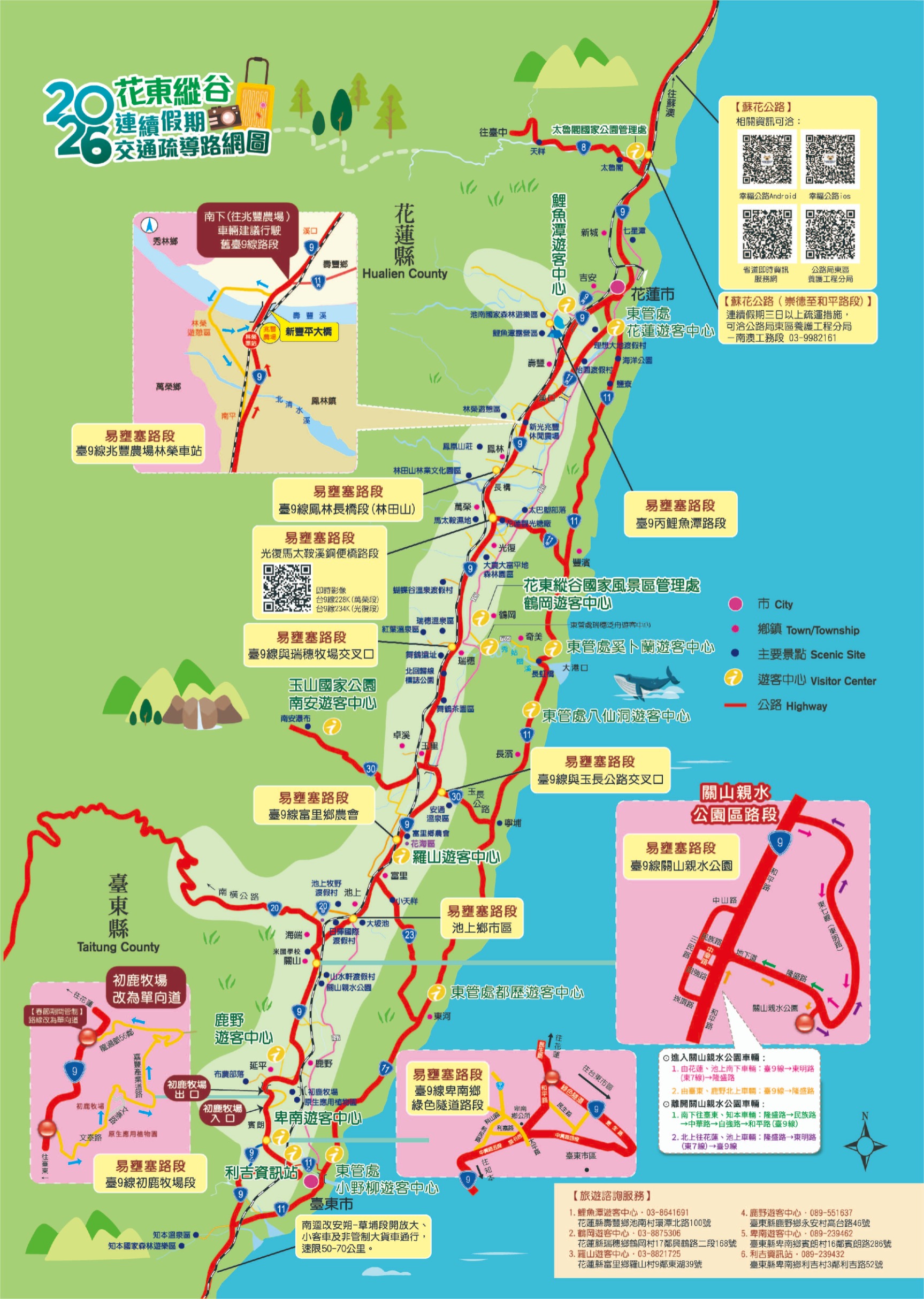 另為提供旅客交通旅遊資訊所需,本處整合交通及旅遊相關資訊,製作「2026年花東縱谷連續假期交通疏導路網圖」電子版提供民眾下載使用。