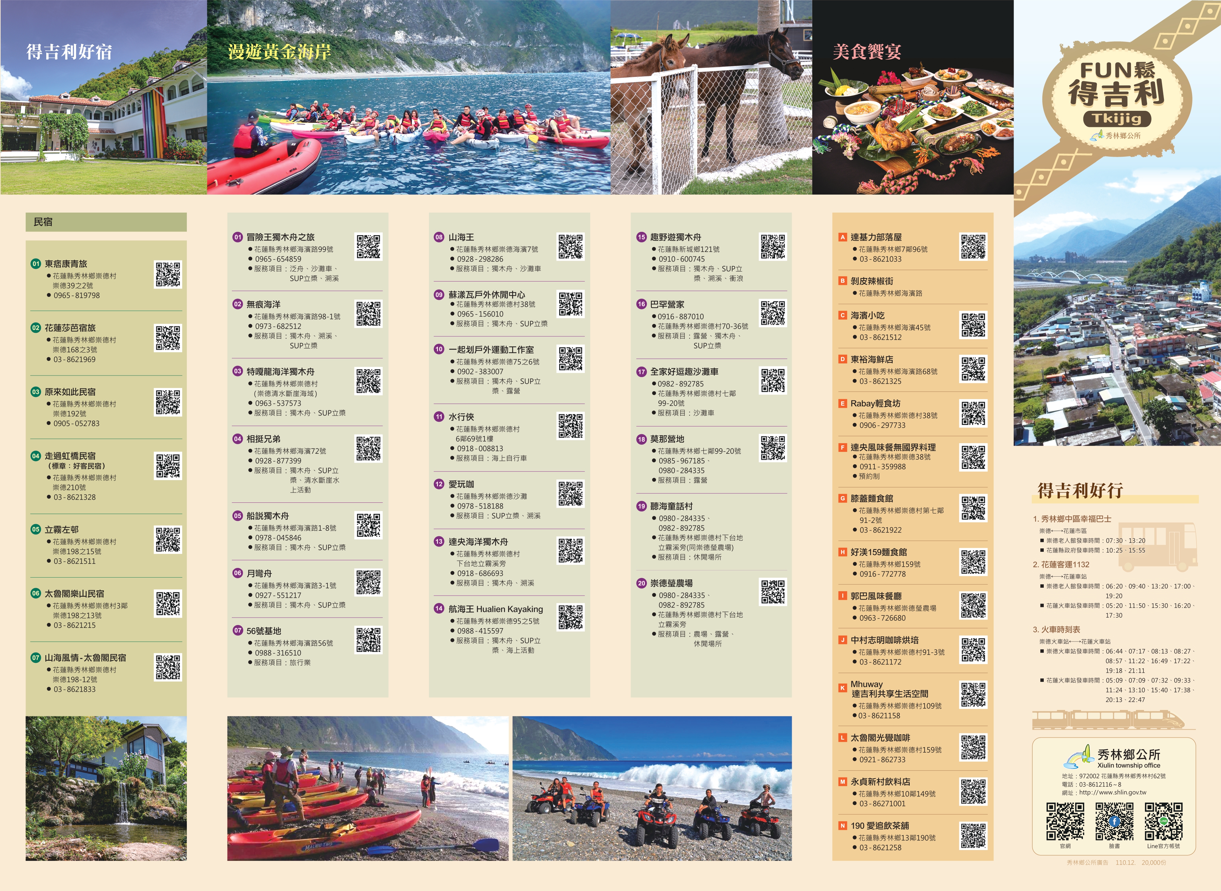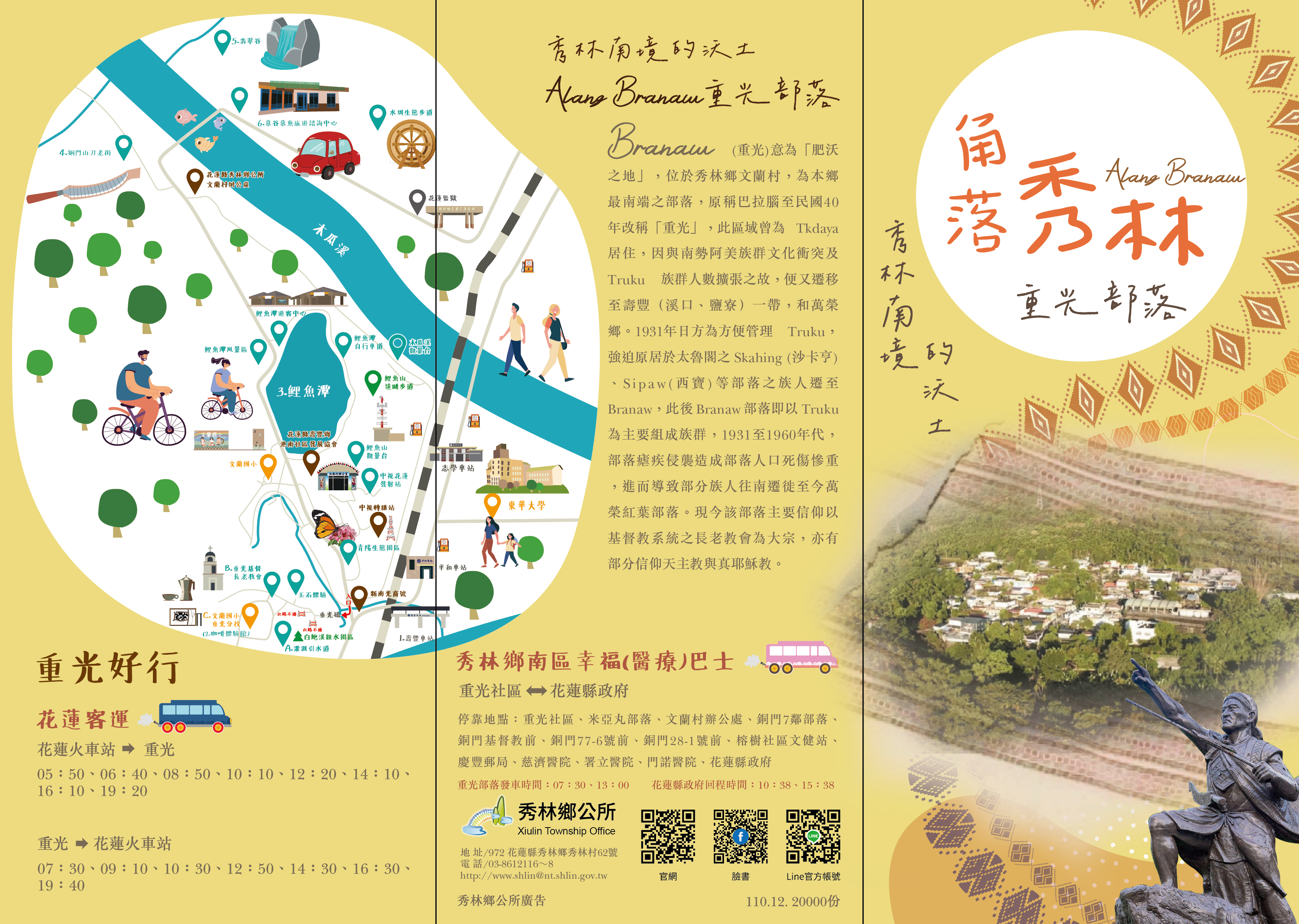 訊息內容花蓮縣秀林鄉公所 110年度部落導覽地圖及宣傳摺頁 崇德村及文蘭村重光部落觀光旅遊導覽 詳情請至花蓮縣秀林鄉公所官方網站查詢,相關內容紙本如有需求可逕向花蓮縣秀林鄉公所文化觀光課杜慶弘課員洽詢,電話☎️:03-8612116分機725相關連結花蓮縣秀林鄉公所官方網站相關照片