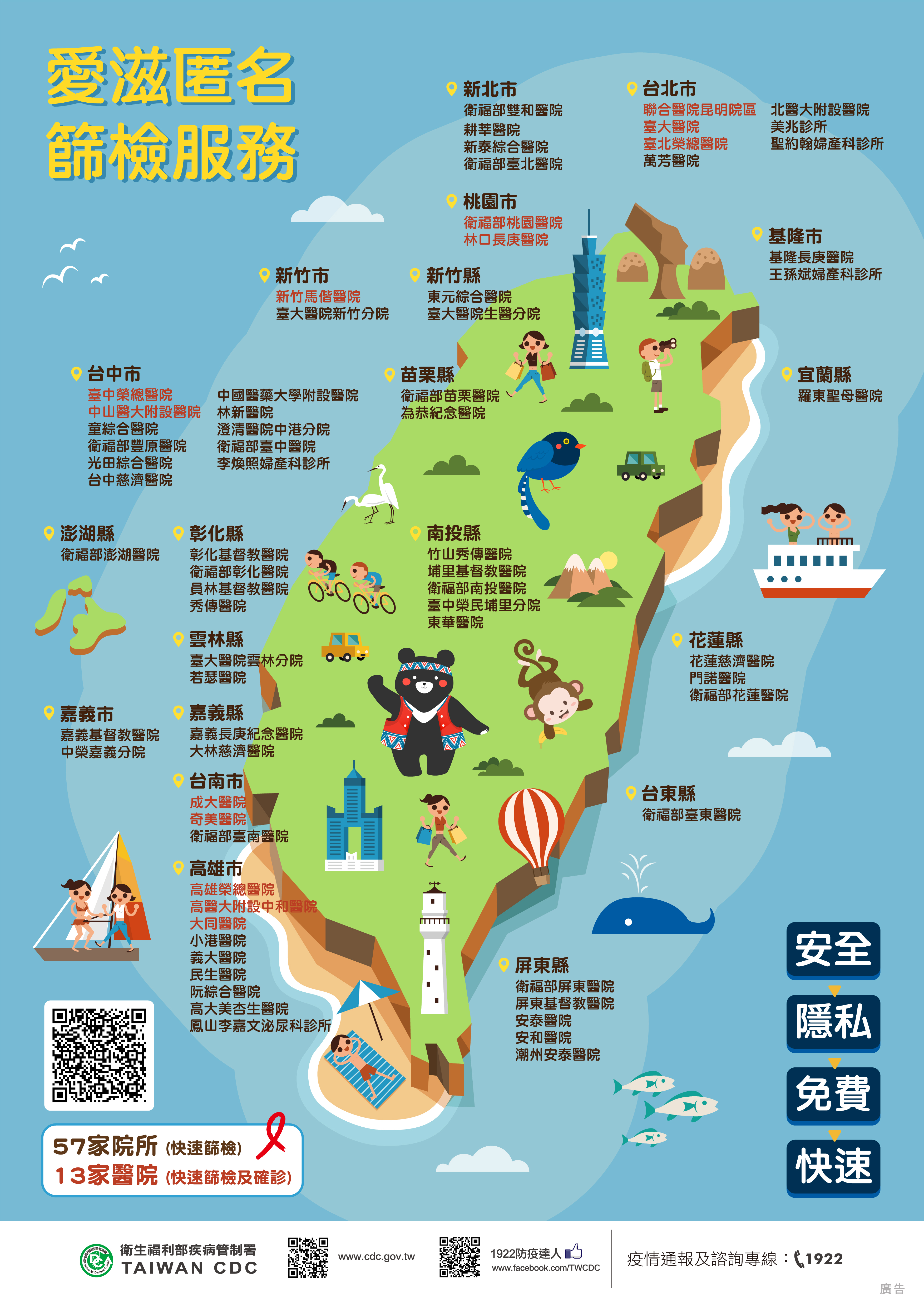 - 若對自己本身健康狀況不明瞭者,可預約至醫院做匿名篩檢諮詢,同時至匿名諮詢網進行風險評估;各匿名篩檢點服務地點名單請參考下方附件。