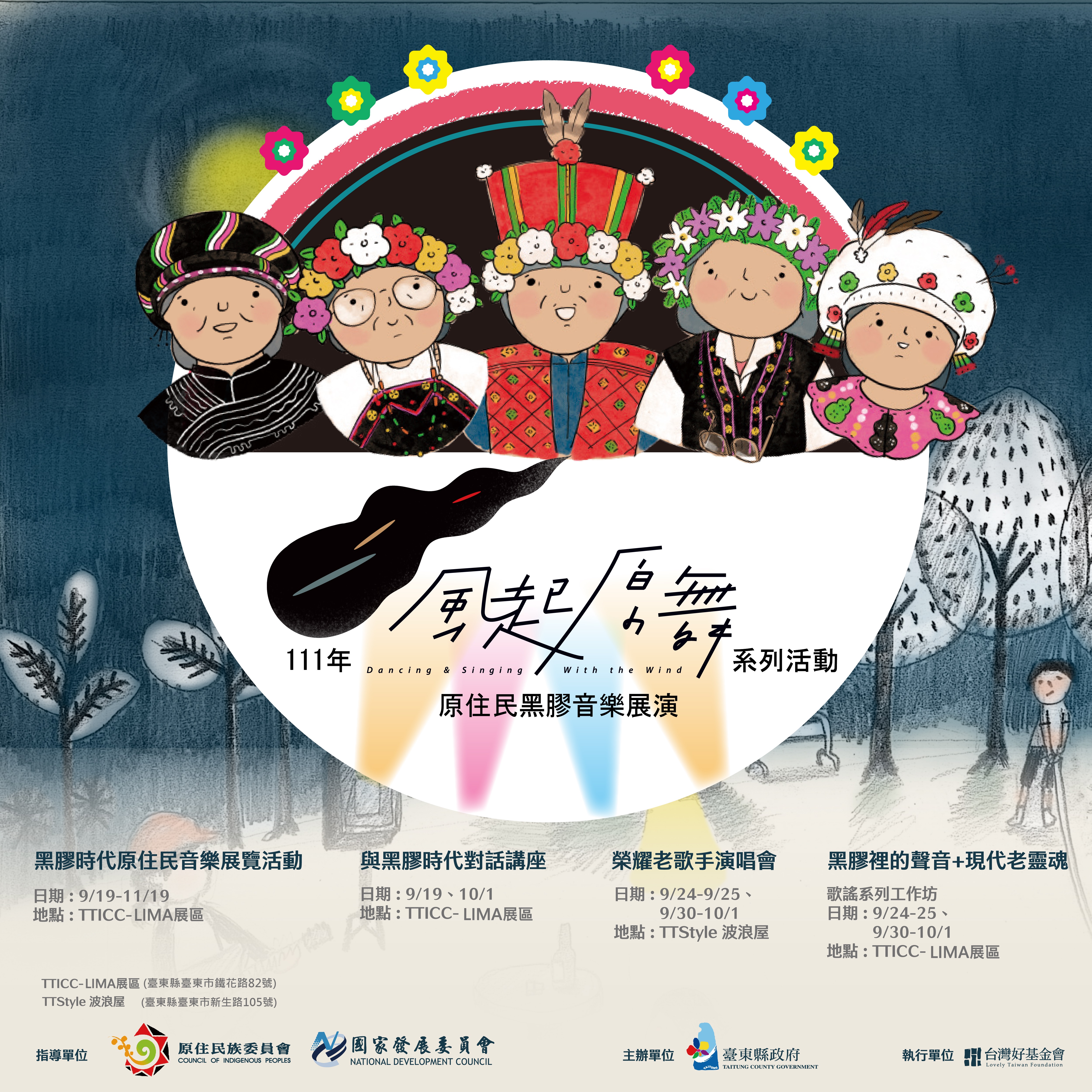 訊息內容 「111年『風起原舞系列活動』原住民黑膠音樂展演活動」 🌟 活動時間: 9月19日起在TTICC LIMA及TTStyle波浪屋展區辦理為期2個月的「黑膠時代原住民音樂展覽」 🌟 活動地點: TTICC LIMA 展區 (臺東縣臺東市鐵花路82號) TTStyle波浪屋(臺東縣臺東市新生路105號) 詳情請至 縱谷原遊會官方網站 「南島台東-臺東縣原民處」臉書粉絲專頁:https://www.facebook.com/aborigine089 相關連結「111年『風起原舞系列活動』原住民黑膠音樂展演活動」相關照片