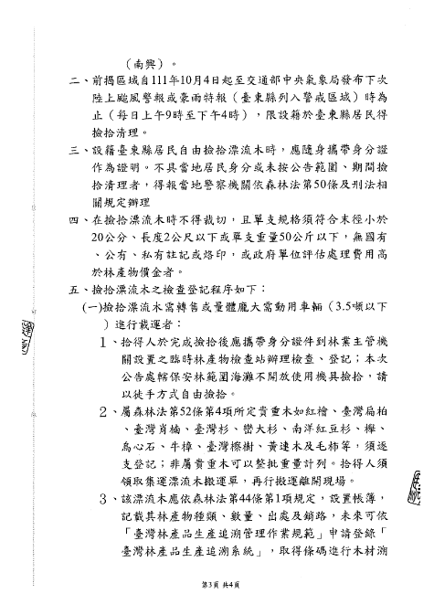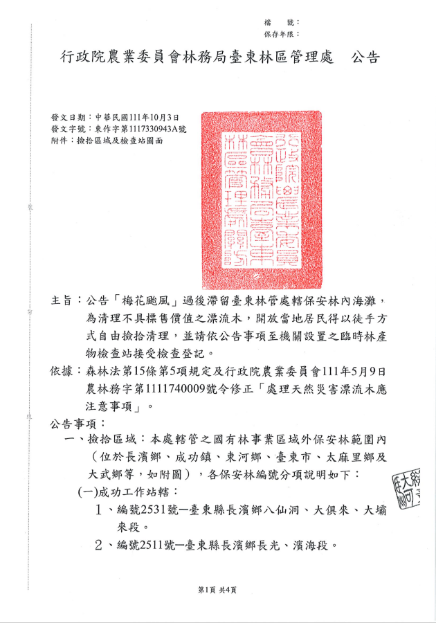 臺東林管處自10月4日起開放海岸地區保安林滯留漂流木自由撿拾