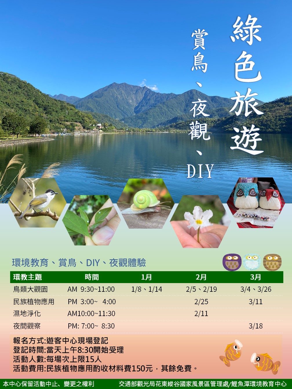 交通部觀光局(現為觀光署)花東縱谷國家風景區管理處為推動綠色旅遊政策,將自112年1月至3月之每週末(連續假日除外)定時辦理1場次環境教育課程體驗活動,鼓勵民眾建立友善環境的生活態度,期為後疫情時代觀光注入綠色旅遊活力,同時促進在地綠色產業發展。歡迎民眾攜家帶眷一同到鯉魚潭旅遊,認識鯉魚潭的生態與原住民文化。
