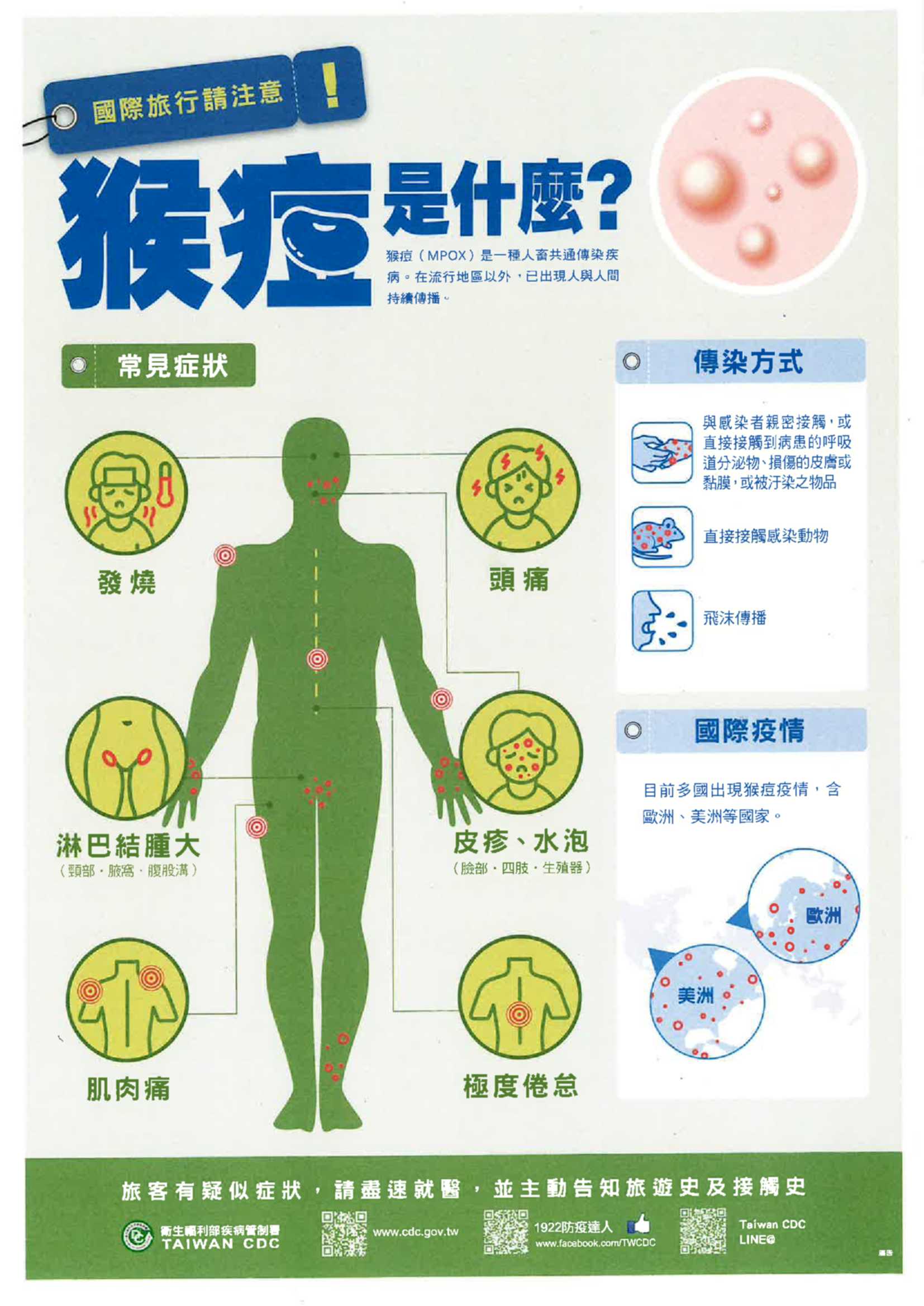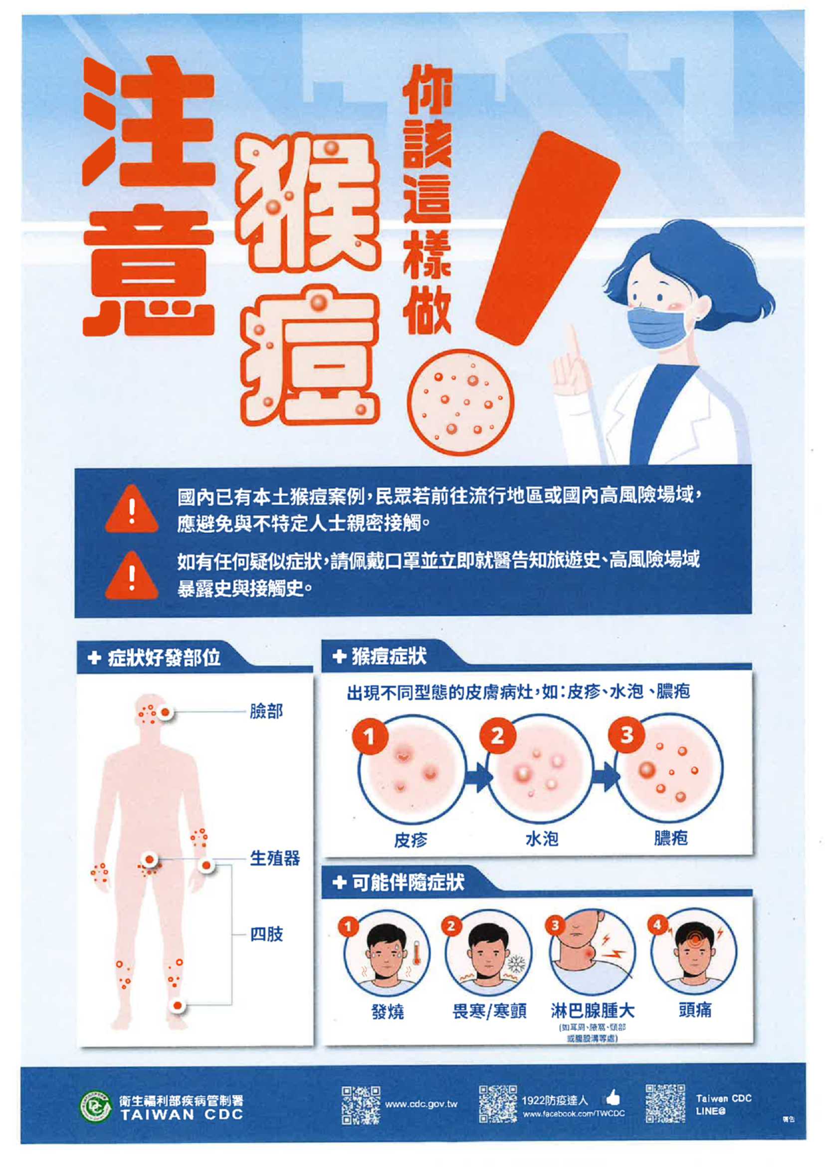 ☝️有鑑於國內已出現猴痘本土案例,加以各國邊境檢疫政策逐步鬆綁,人員交流漸頻繁,且猴痘病毒感染潛伏期可長達21天,民眾感染風險提升,為強化社會大眾猴痘防治知能與風險意識,請運用各種管道加強猴痘防治宣導。