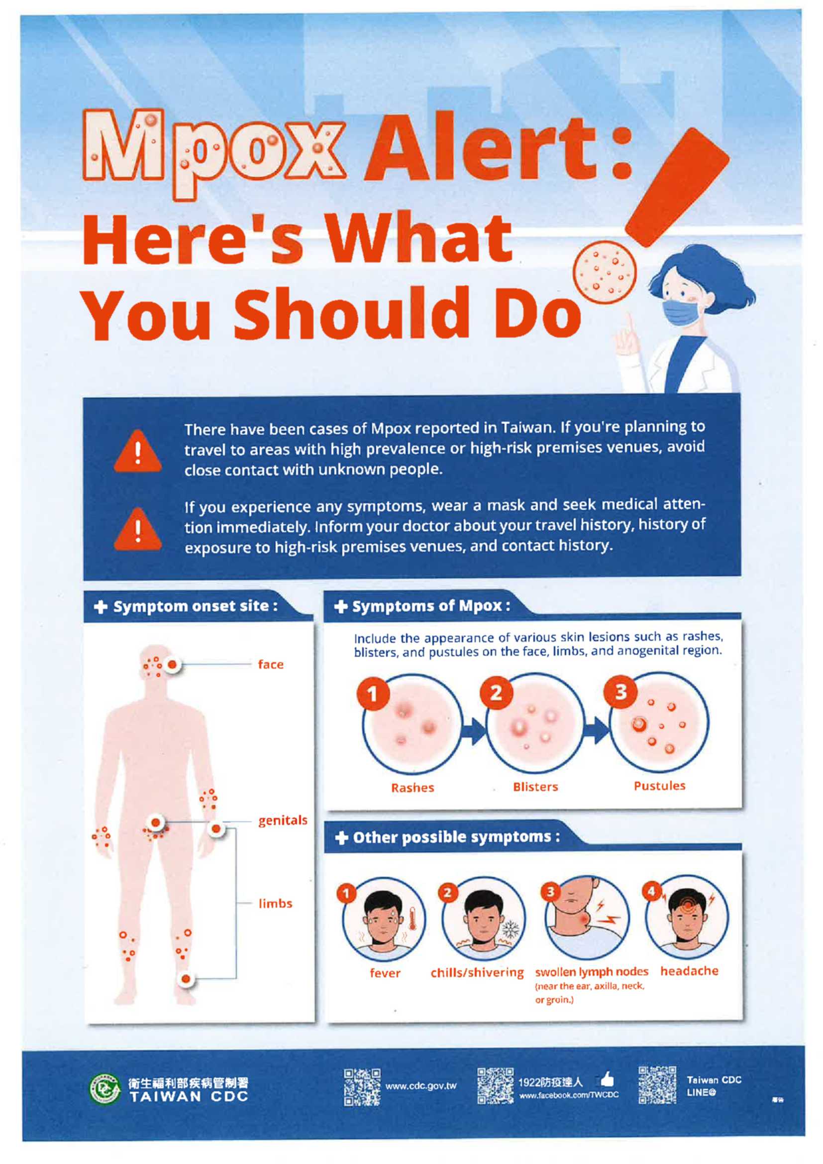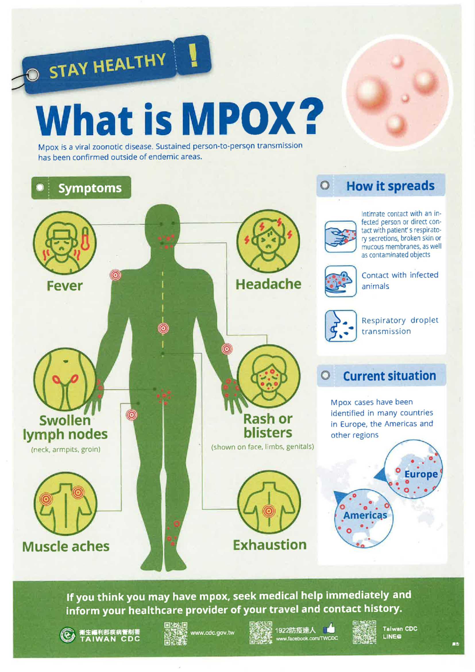 為交通部觀光署函轉疾管署因應國內本土猴痘(Mpox)疫情,請加強防治宣導,若有相關症狀,請儘速配戴口罩並就醫。😷