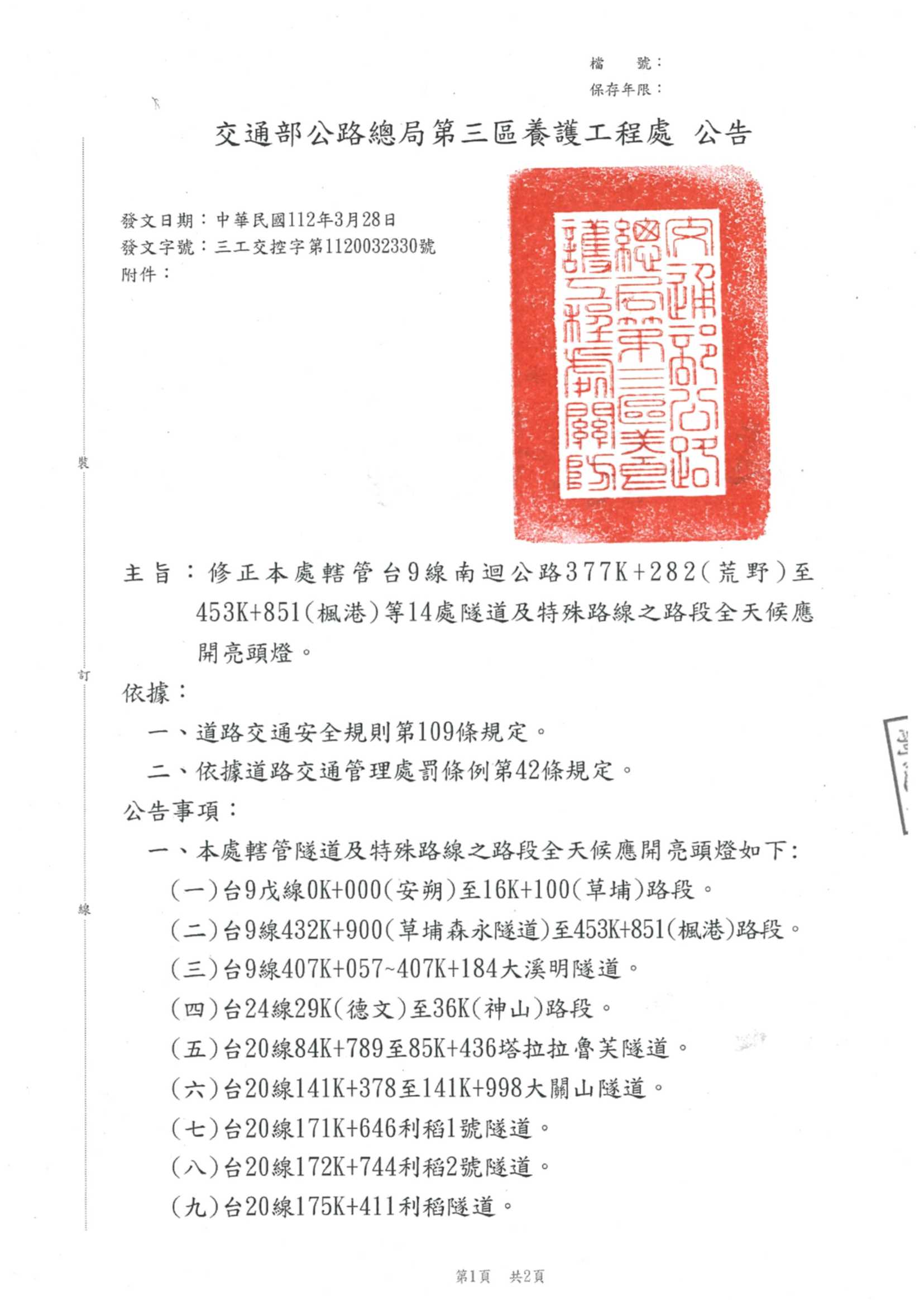 訊息內容台9線南迴公路377K+282(荒野)至453K+851(楓港)等14處應全天候開頭燈,自公告日實施。 📣行經下方公告函之隧道或路段,請記得開頭燈喔!😉 附件檔案交通部公路總局第三區養護工程處公告(.pdf)相關照片