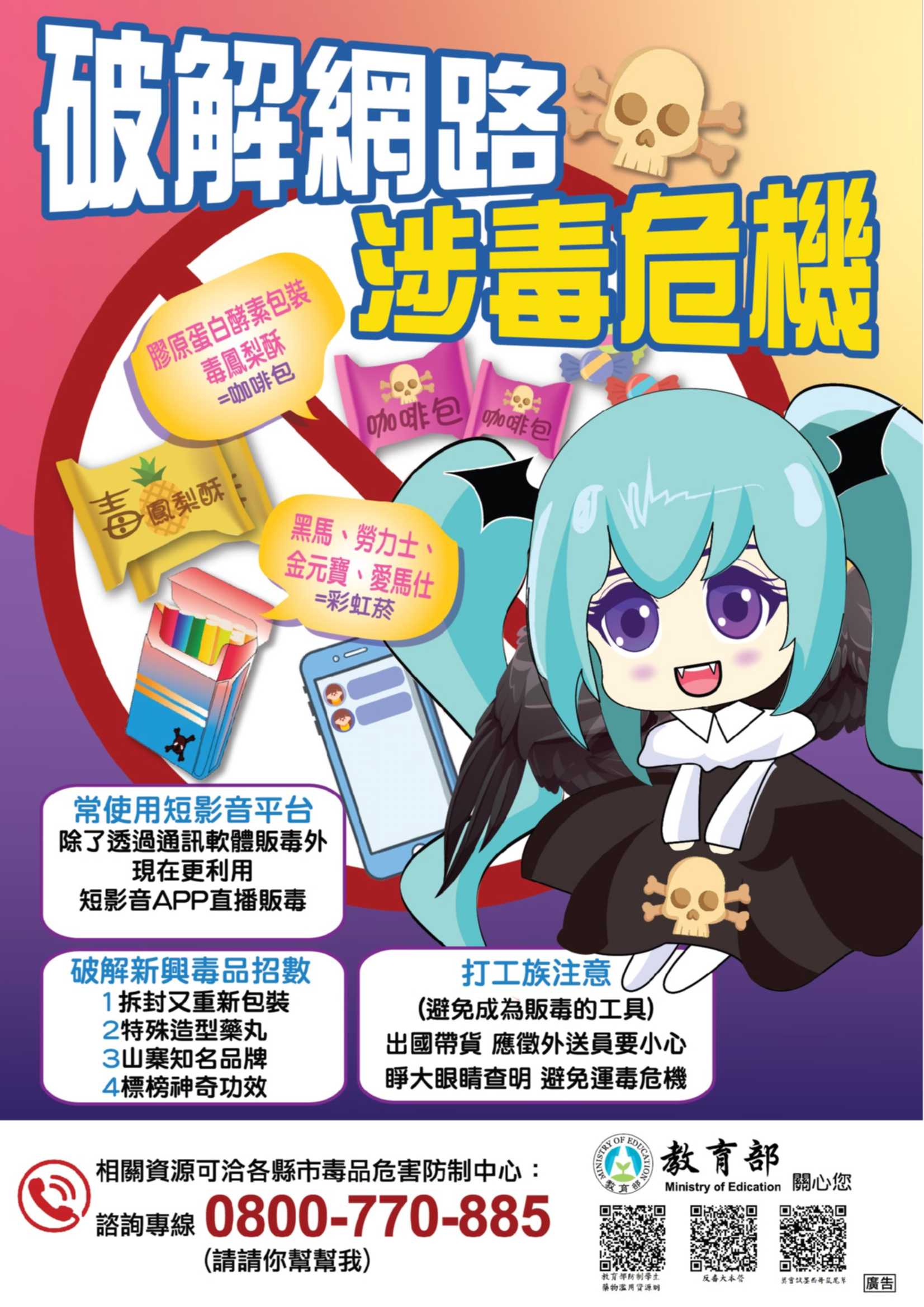 訊息內容為落實新世代反毒策略,並提升民眾對「防制學生網路涉毒與販毒」的議題的關注與宣傳,教育部特製作相關電子海報「破解網路販毒危機」「網路奇怪術語_提高警覺小心」。教育部、花東縱谷國家風景區管理處,關心您😉 相關照片