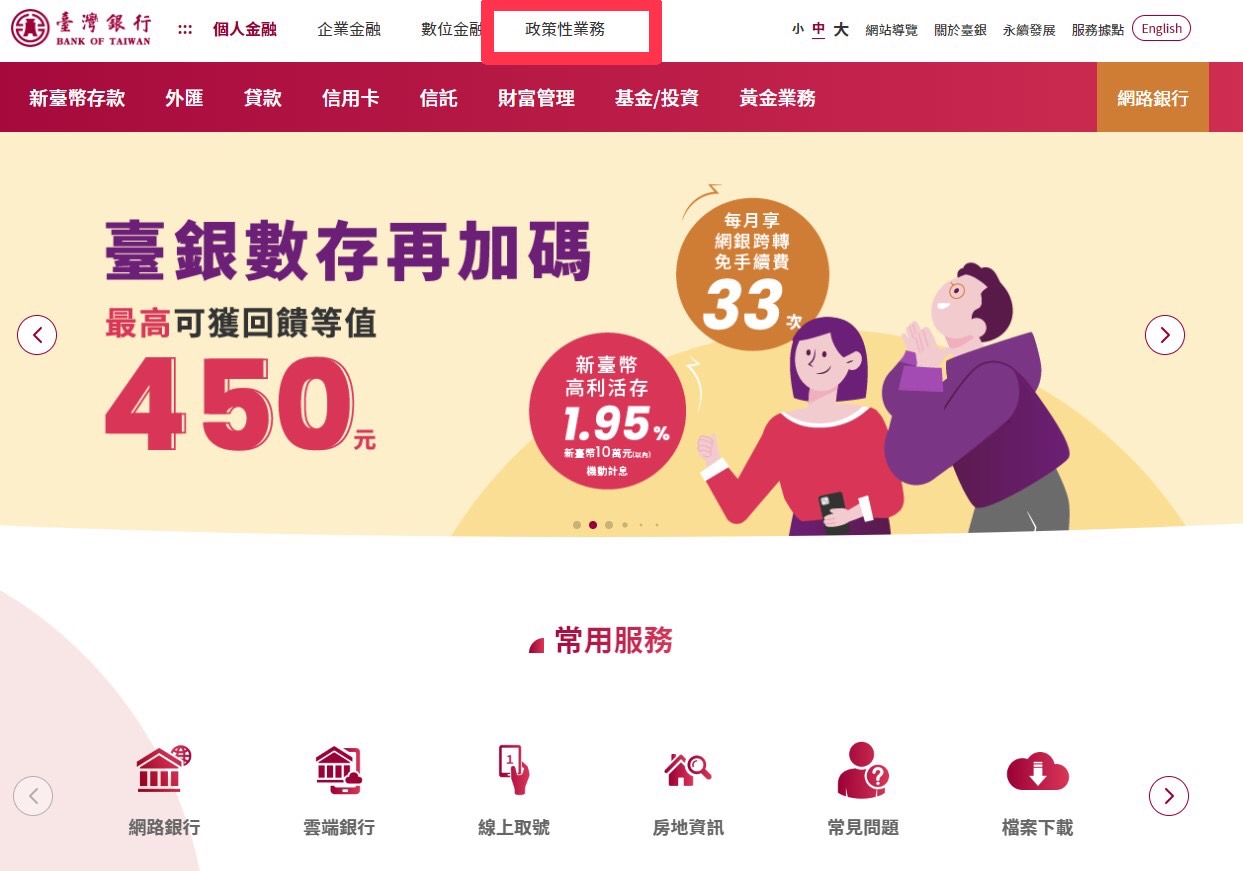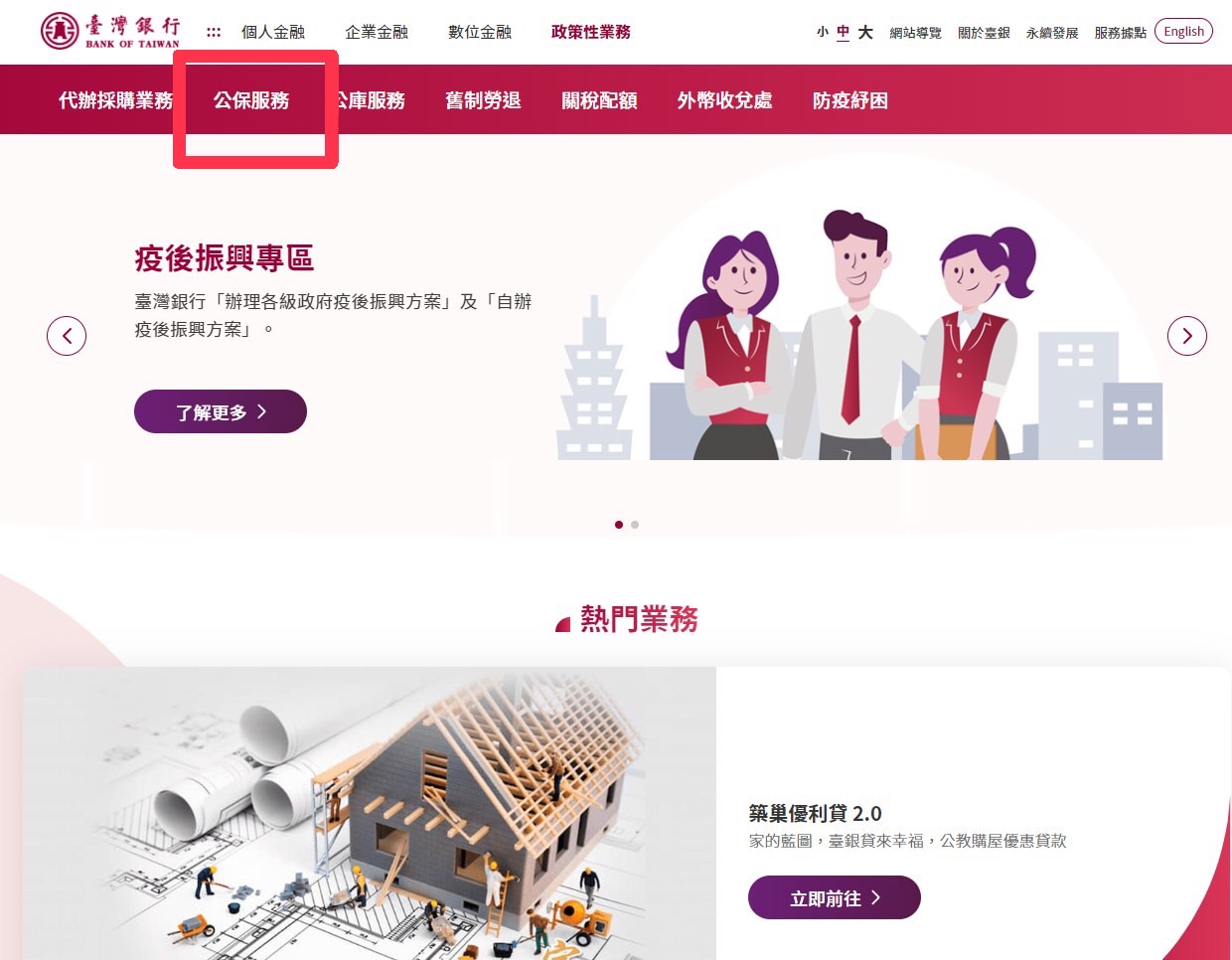 臺灣銀行全球資訊網升級,「公保服務」網頁歸屬網站四大服務之「政策性業務」項下