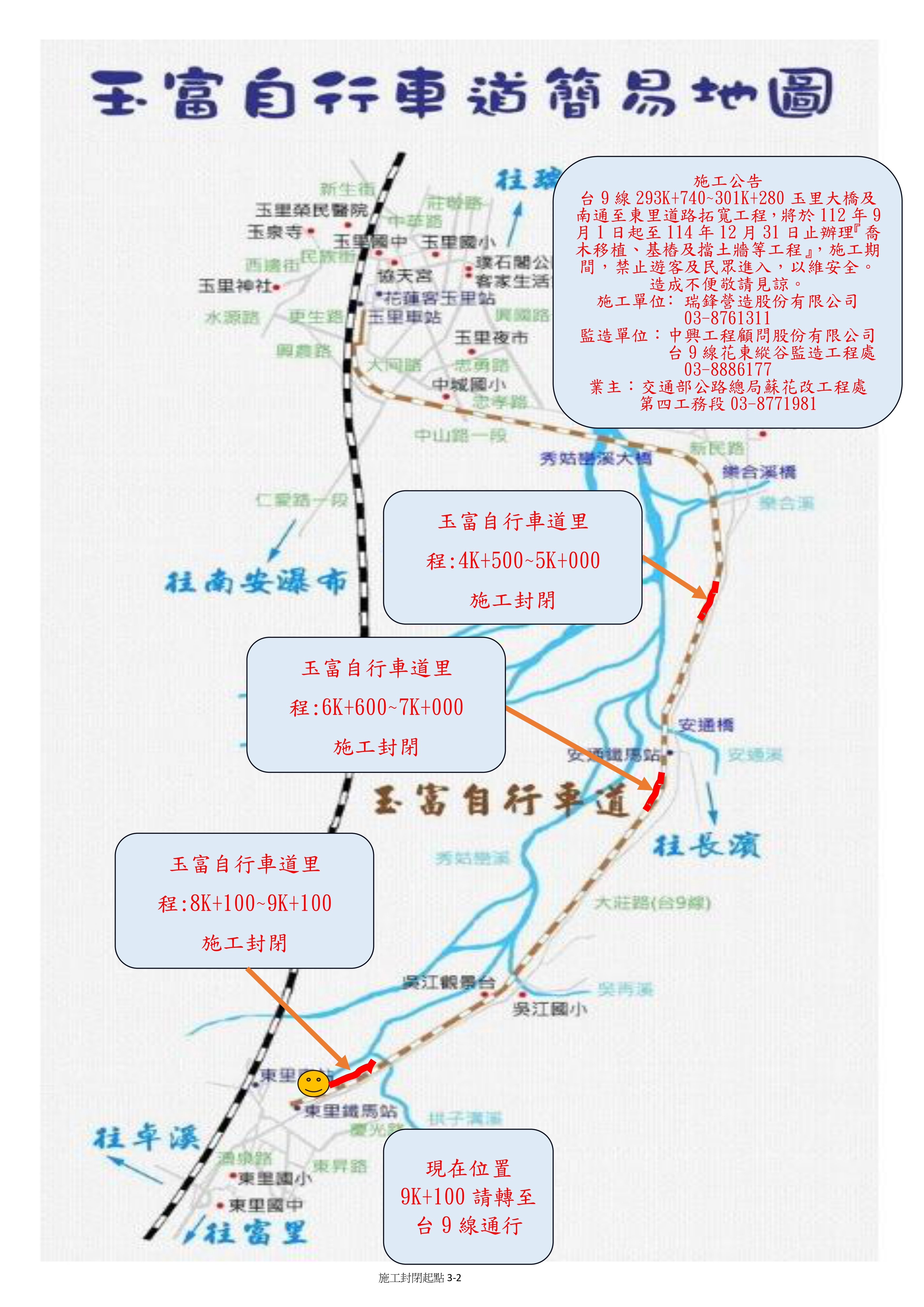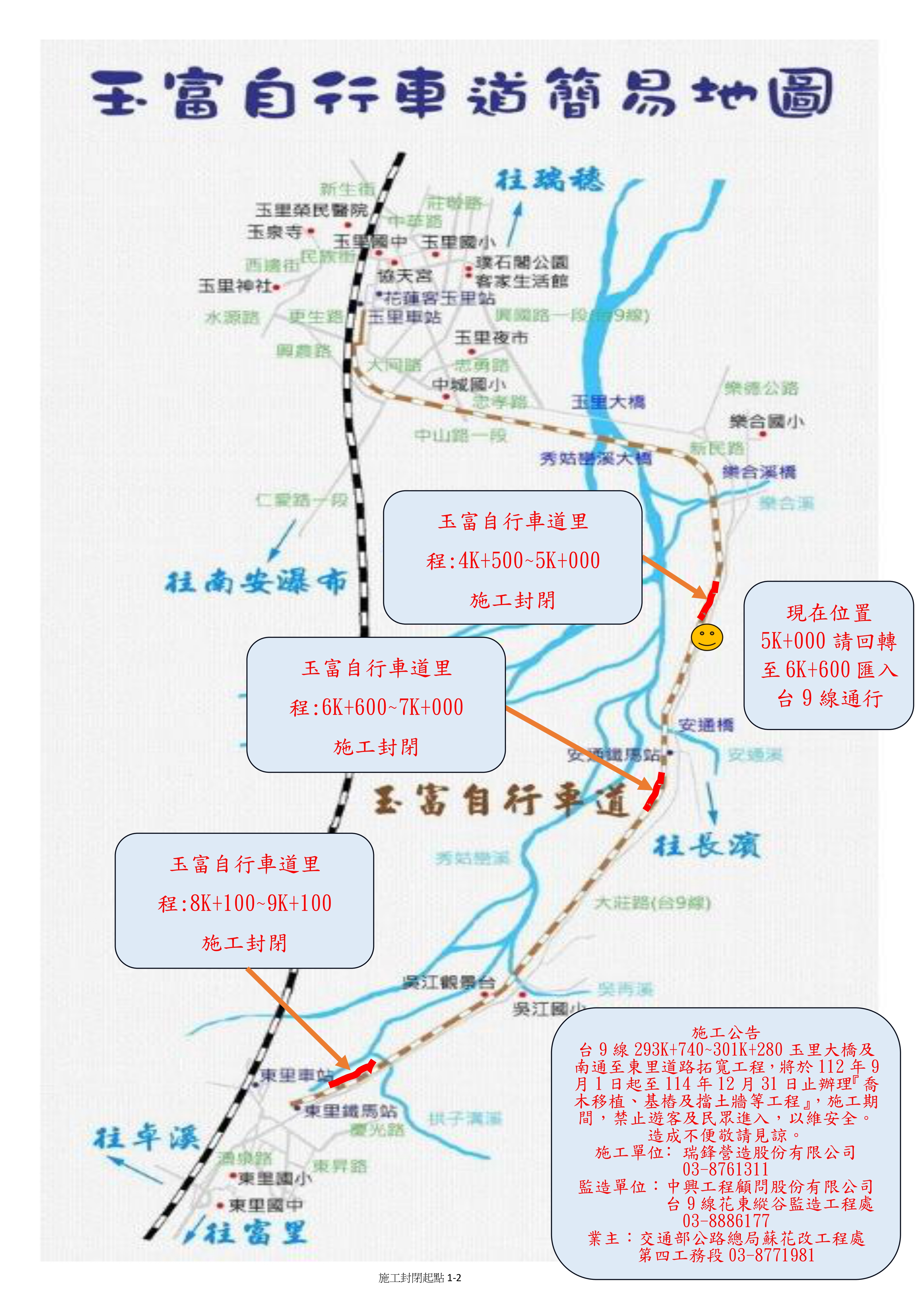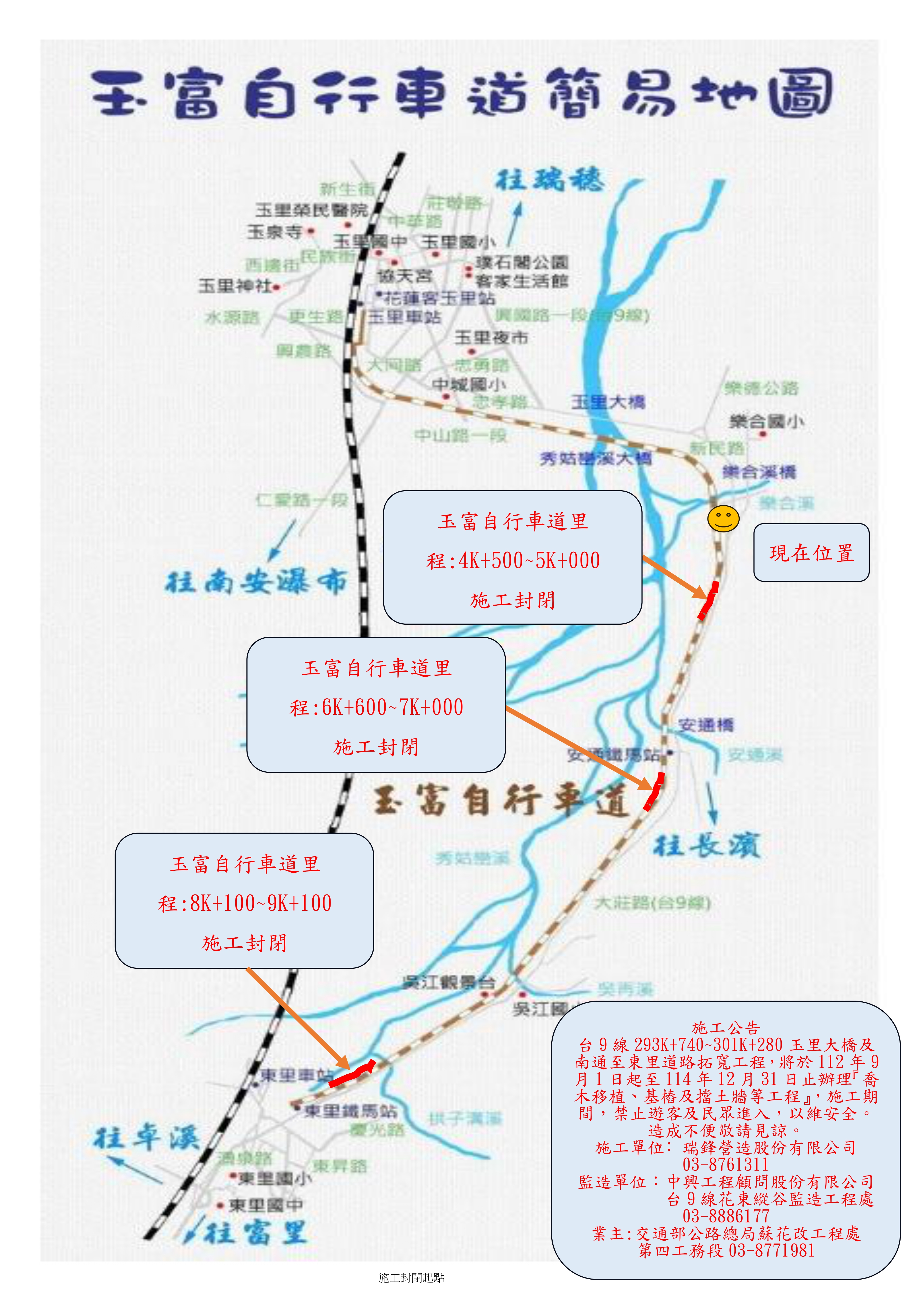 交通部公路總局蘇花公路改善工程處第四工務段(下稱第四工務段)辦理「台9線293K+740~301K+280玉里大橋及南通至東里道路拓寬工程」,自即日起至114年12月31日止,封閉玉富自行車道部份路段如下: