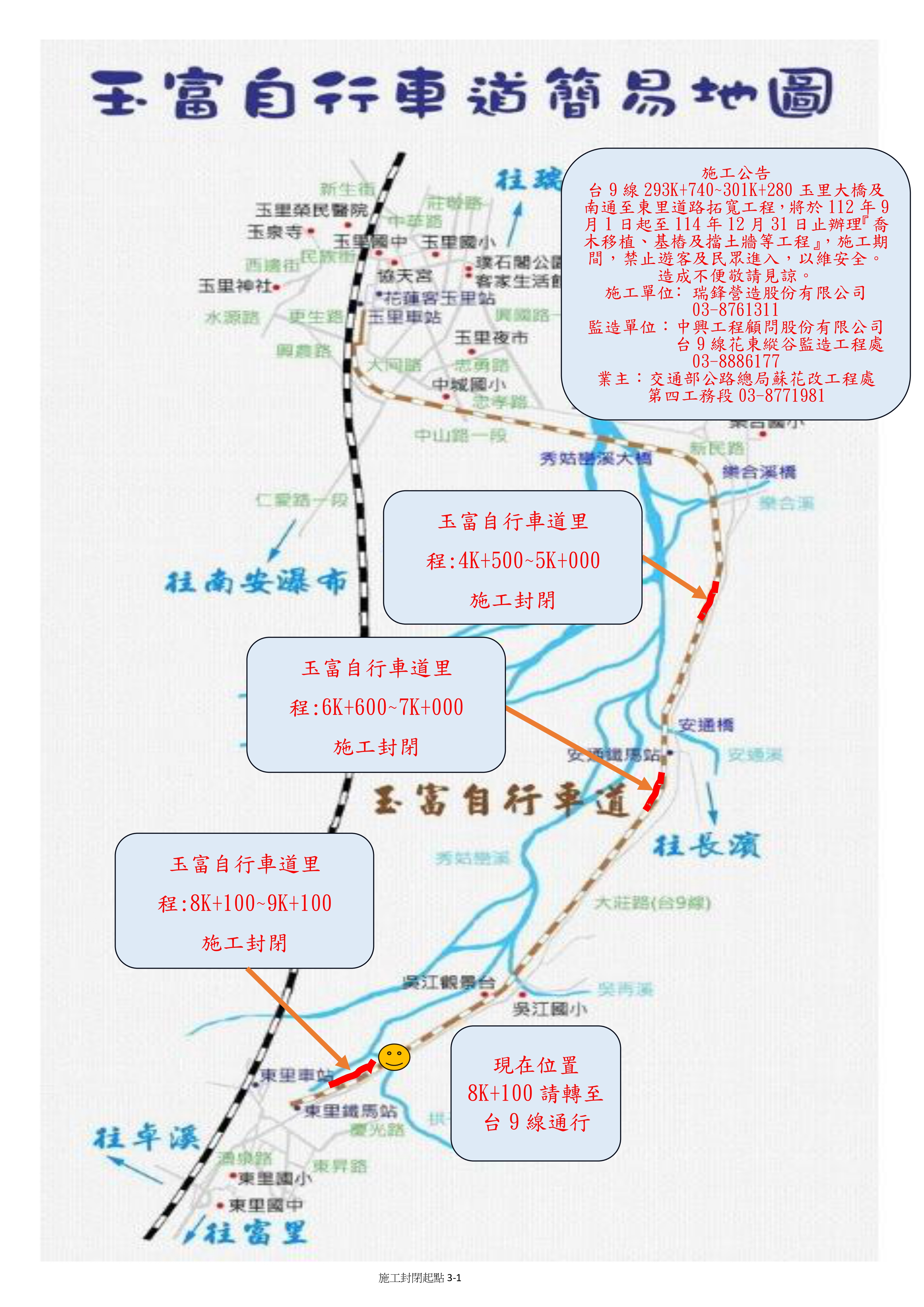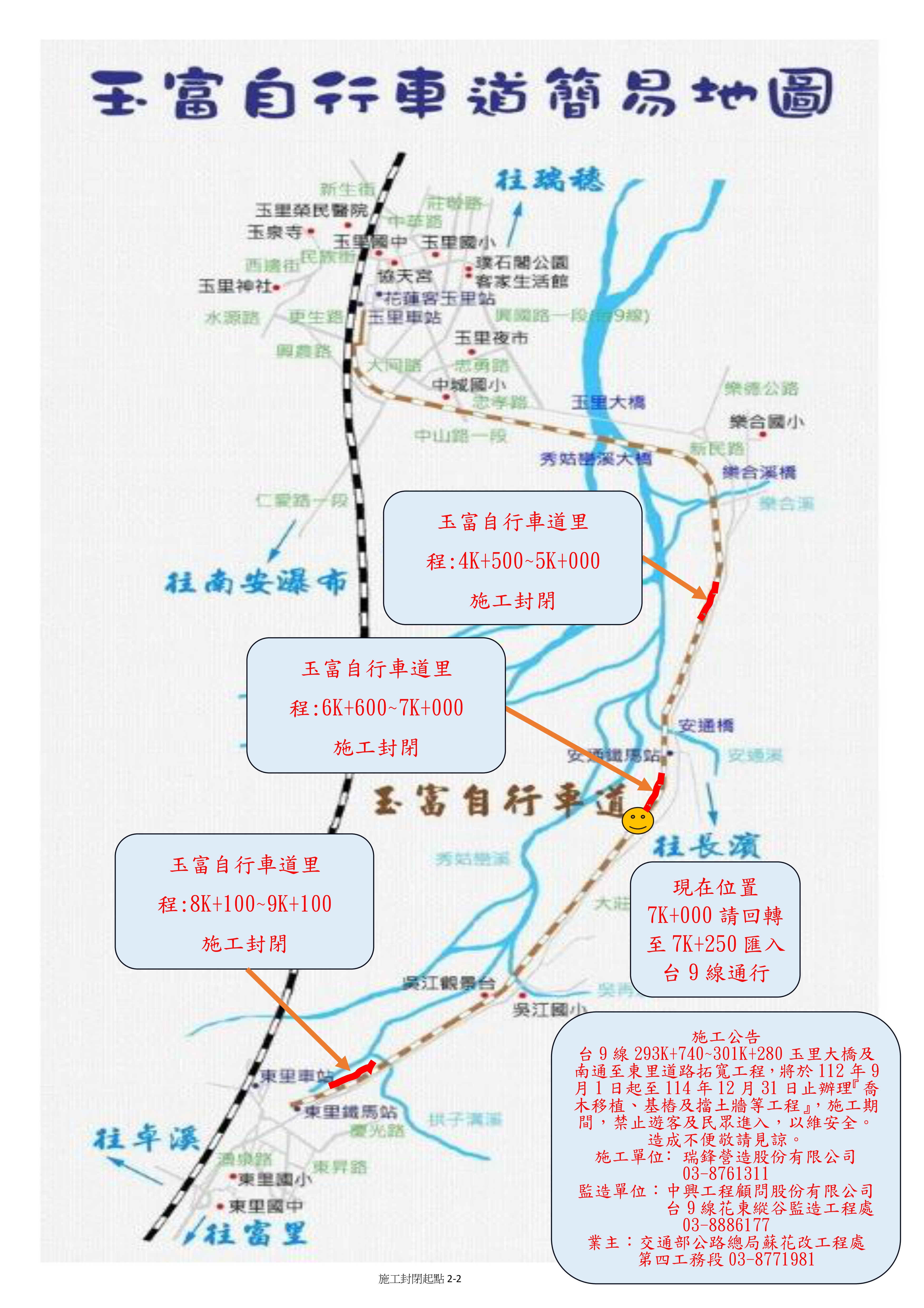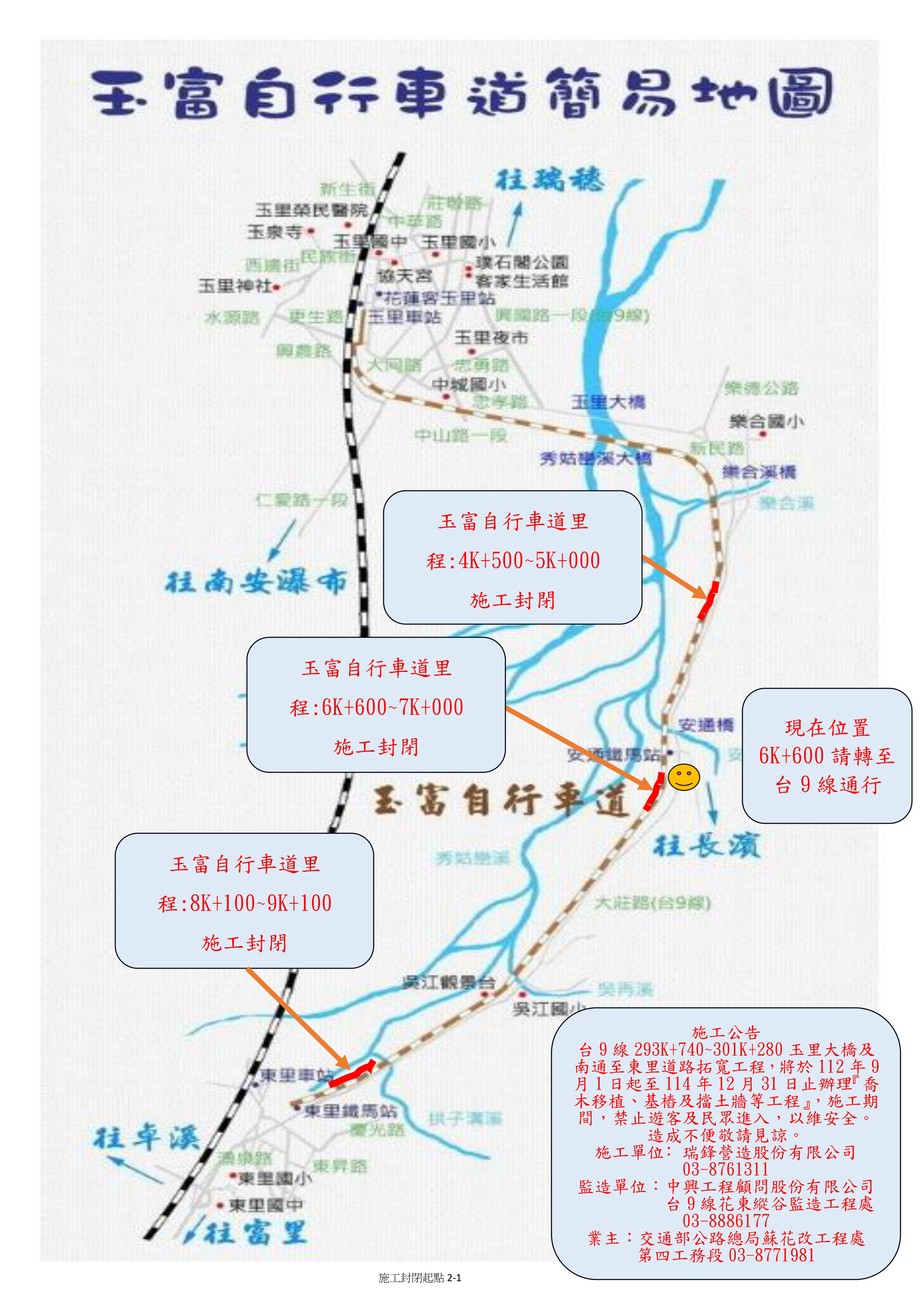 交通部公路總局蘇花公路改善工程處第四工務段(下稱第四工務段)辦理「台9線293K+740~301K+280玉里大橋及南通至東里道路拓寬工程」,自即日起至114年12月31日止,封閉玉富自行車道部份路段如下: