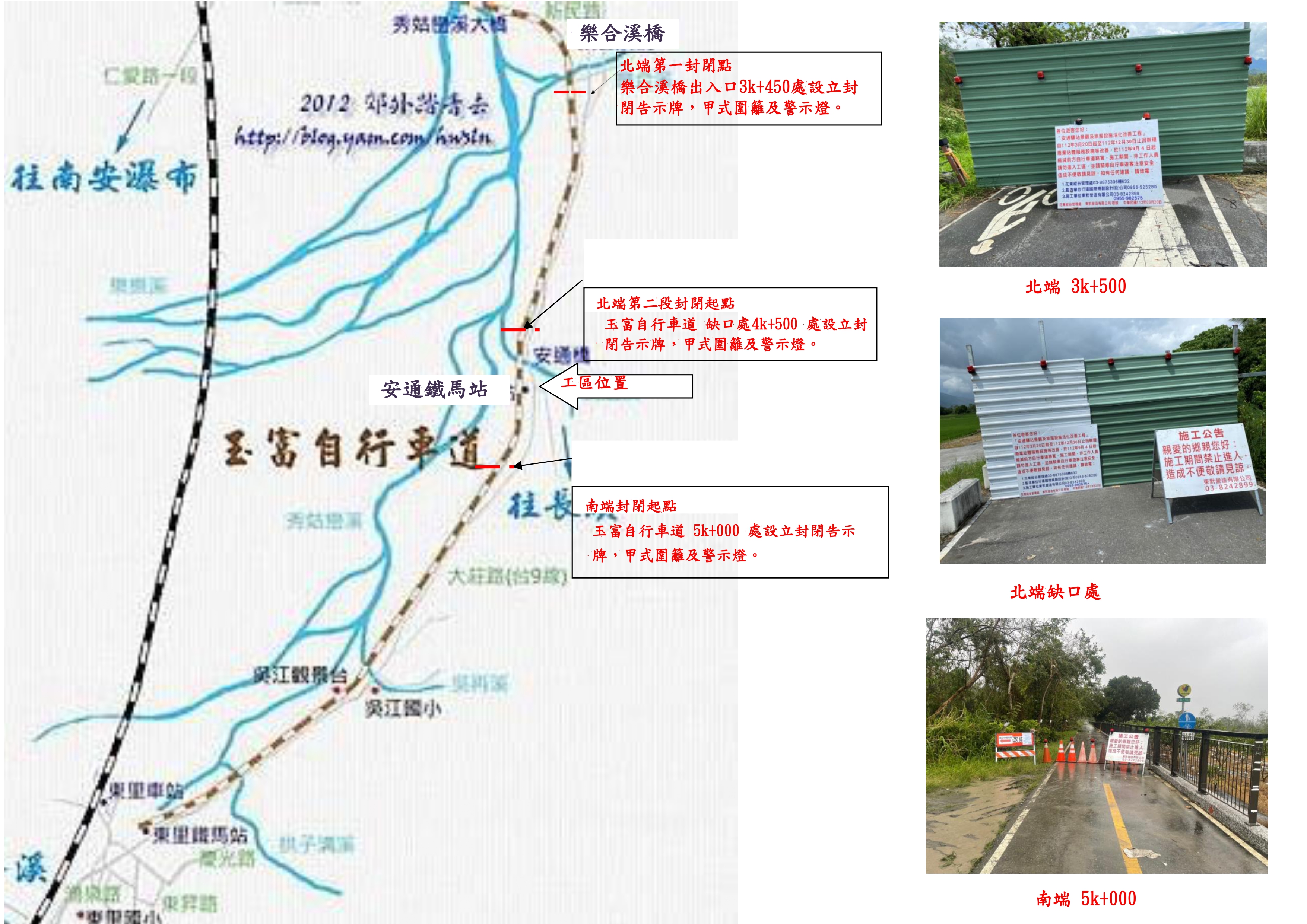 訊息內容因「安通驛站景觀及旅服設施活化改善工程」施作,進行臨時封閉部份玉富自行車道( 3k+450 - 5k+000 ) 路段,為防止車道側破口非工程人員誤入,在4k+500處將設置第二道封閉對外出入口,並在各封閉端皆會擺設施工相關訊息及交維職安警語,請前往的民眾小心騎乘並提早改道。😉 附件檔案「安通驛站景觀及旅服設施活化改善工程」封閉玉富自行車道3k+450至5k+000路段_封閉圖0907版(.pdf)相關照片