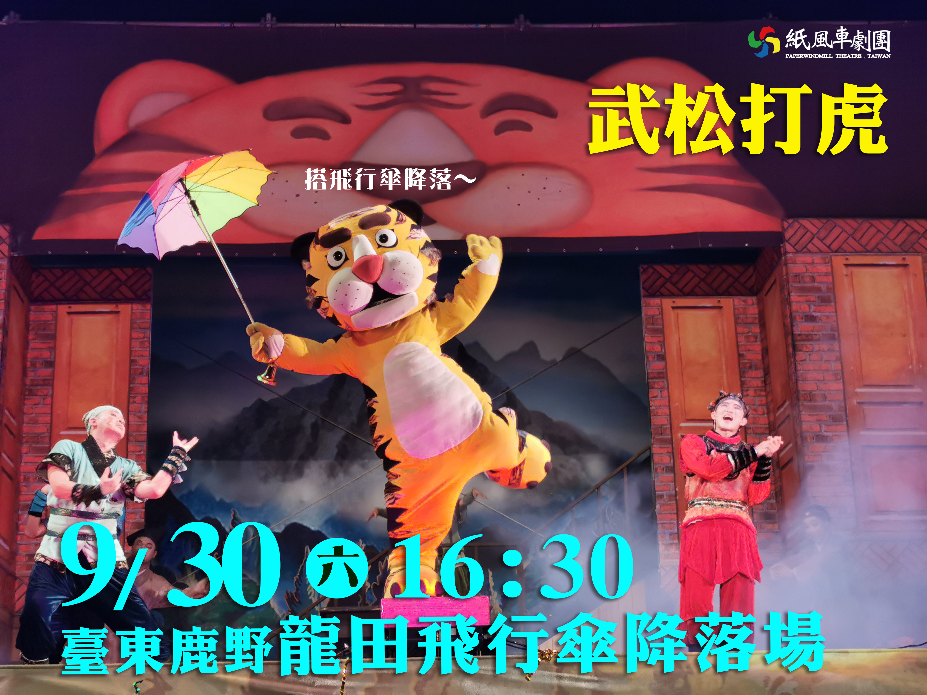 交通部觀光署花東縱谷國家風景區管理處(下稱縱管處)為推廣在地觀光,特別邀請連續10年獲得文化部臺灣品牌團隊、深受大朋友小朋友青睞的「紙風車劇團」,於112年9月30日下午4時30分在臺東縣鹿野鄉龍田飛行傘降落場上演精彩劇碼「武松打虎」,全程免費參與!😉
