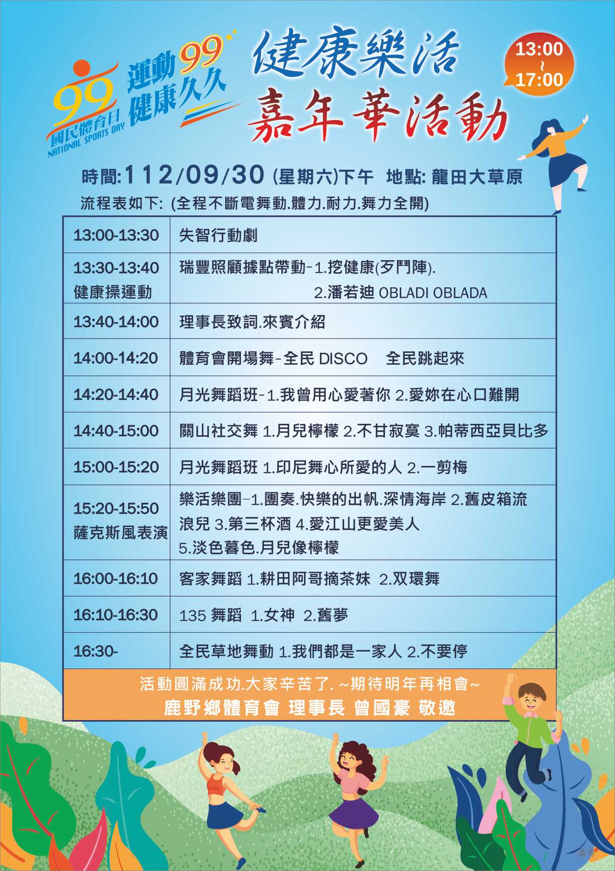 除了精彩的戲劇演出之外,臺東縣鹿野鄉體育會與臺東縣鹿野鄉龍田社區發展協會亦於112年9月30日下午1時至下午4時30分間在龍田飛行傘降落場舉辦「健康樂活嘉年華活動」,將推出在地農特展品市集及活力熱舞表演,就是要讓遊客一次飽嚐鹿野的豐富與精彩!趁著中秋連假,家長們若想為家中寶貝規劃一趟花東之旅,不妨安排到花東縱谷的鹿野,在孩童的笑靨中共譜一段難忘回憶!