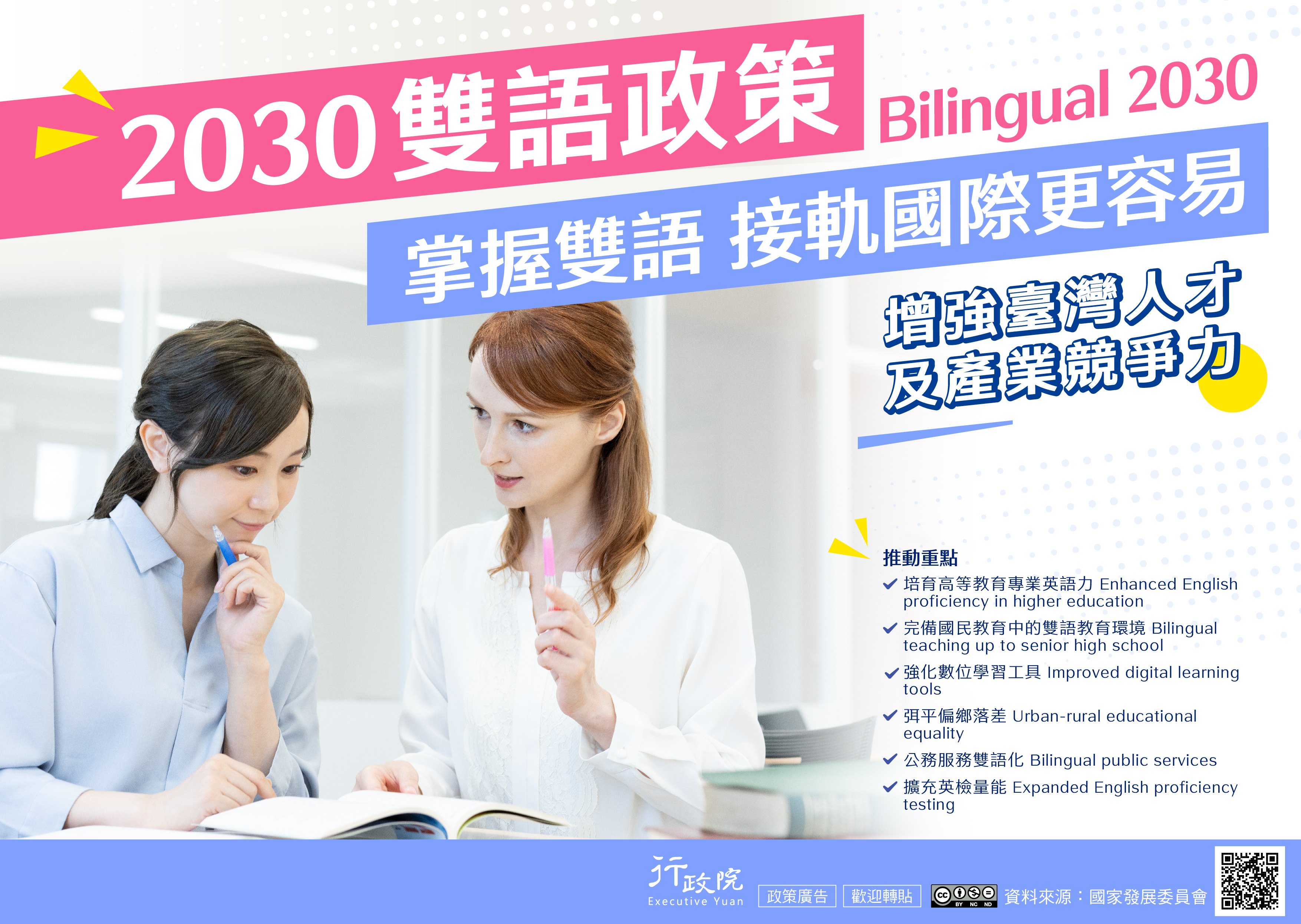 訊息內容為讓臺灣的下一代有更好的英語溝通能力,以接軌國際並吸引跨國企業來臺,並提升產業競爭力,政府積極推動「2030雙語政策」,行政院特策製旨揭說明資料(如下) 相關連結培育雙語專業人才增進國家競爭力 行政院會通過「雙語國家發展中心設置條例」草案相關照片