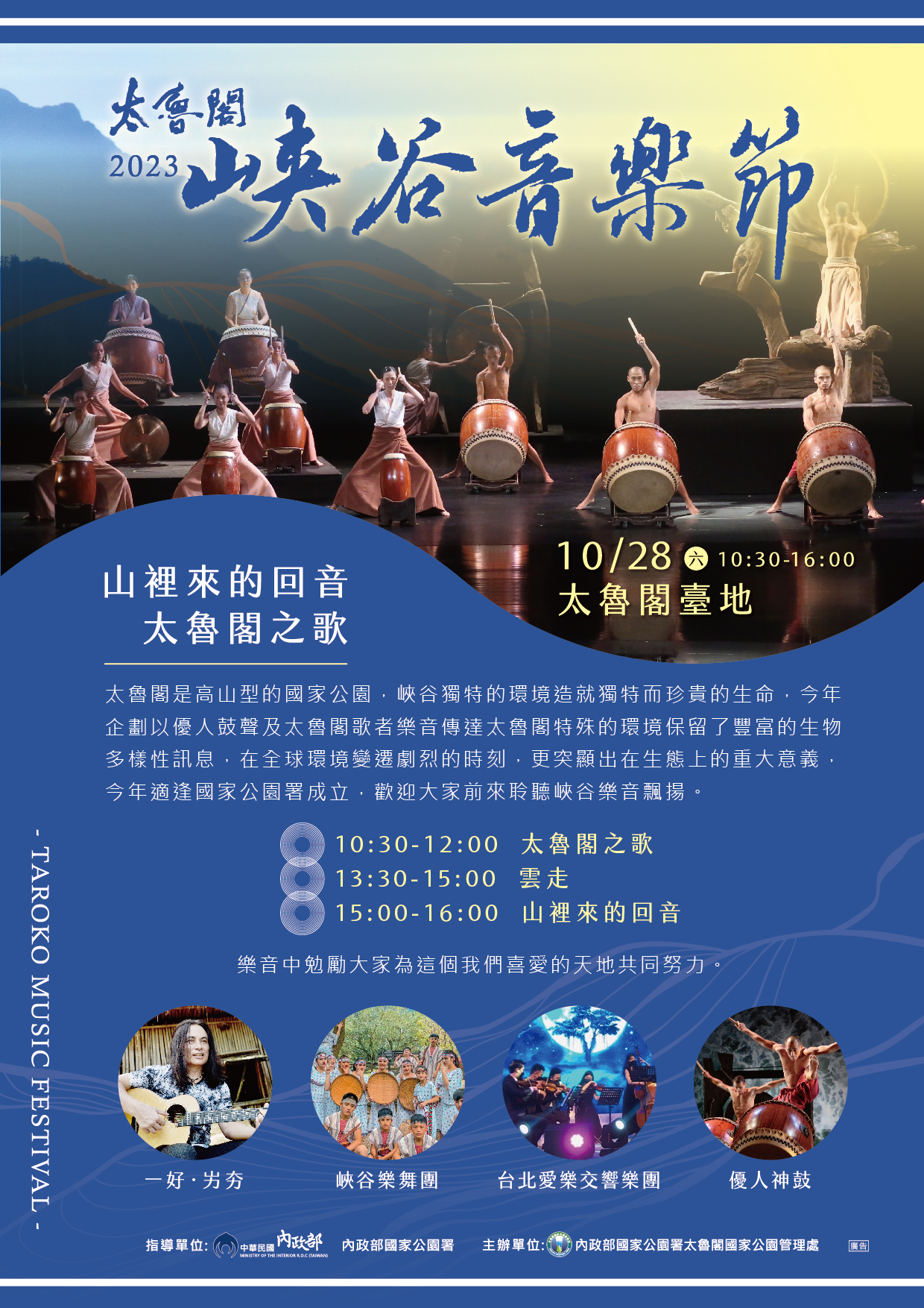 (以下資訊擷字自太魯閣國家公園>最新消息>山里來的回音太魯閣之歌 2023太魯閣峽谷音樂節 10月28日太魯閣臺地登場)