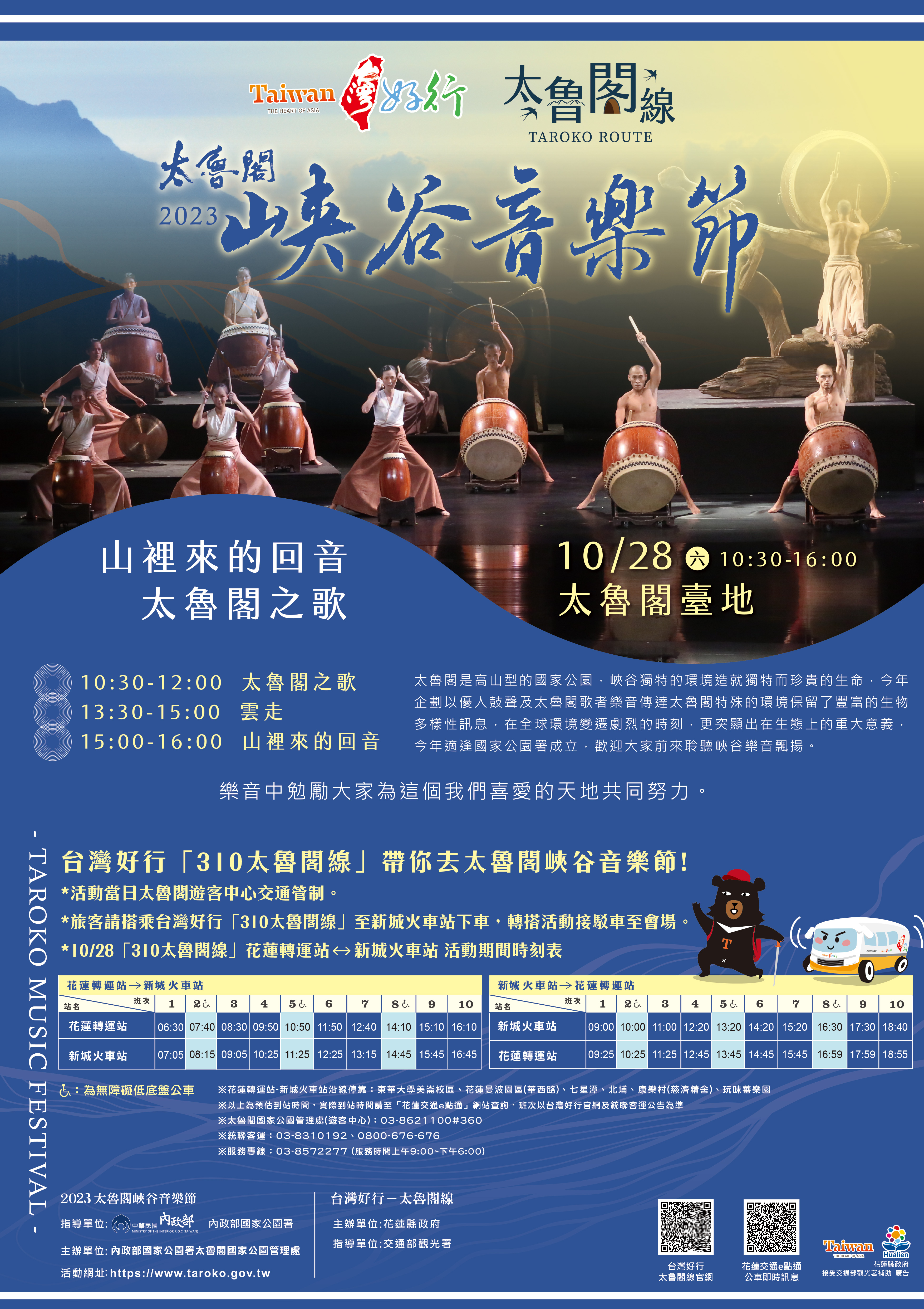 活動當日太魯閣遊客中心交通管制,可搭乘台灣好行「310太魯閣線」至新城火車站下車後,轉搭活動接駁車至會場,時刻表如圖,誠摯邀請您來太魯閣峽谷音樂節!