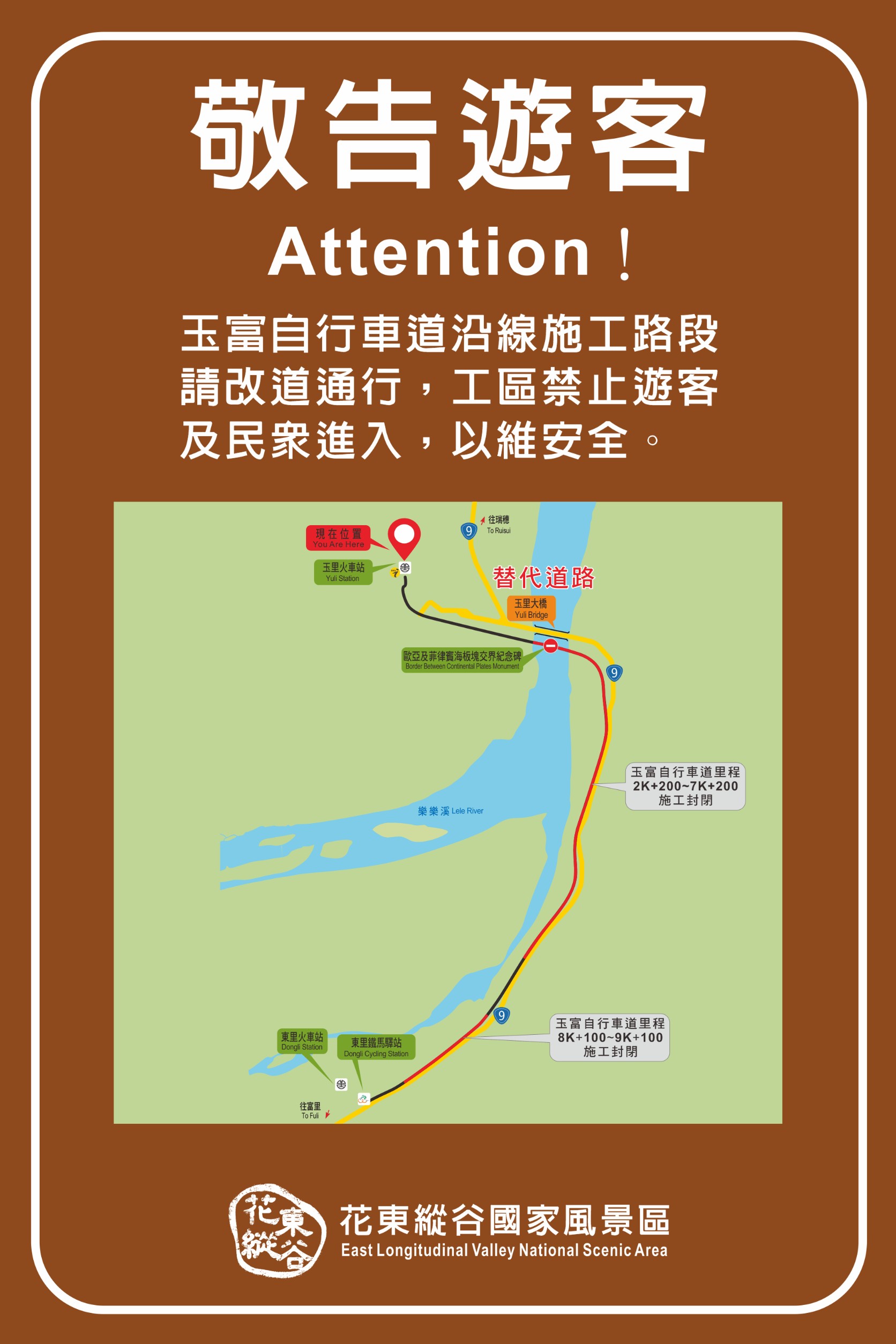 玉富自行車道沿線施工路段請改道通行,工區禁止遊客及民眾進入,以維護安全。