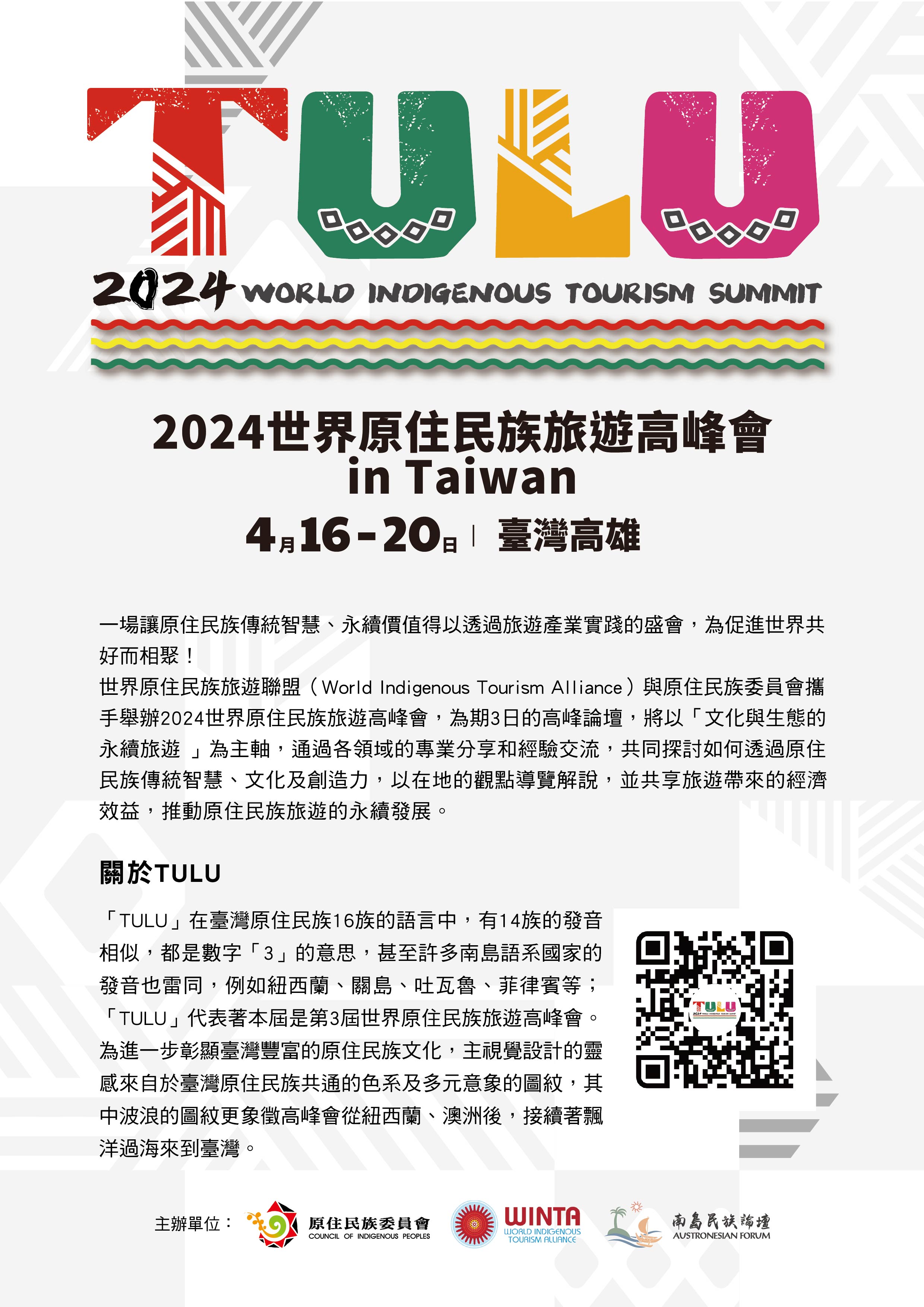 「世界原住民族旅遊高峰會(World Indigenous Tourism Summit),簡稱WITS」係由世界原住民族旅遊聯盟(WINTA)發起,屬國際原住民族及觀光產業之重要盛事;第一屆WITS於2018年由紐西蘭主辦,第二屆WITS受疫情影響延後至2023年由澳洲接辦,臺灣經紐方推薦於2019年取得第三屆WITS主辦權。前兩屆WITS均有來自20多個國家、數百名代表出席,包含官方代表、專家學者以及旅遊業者等,透過跨領域交流互相學習。