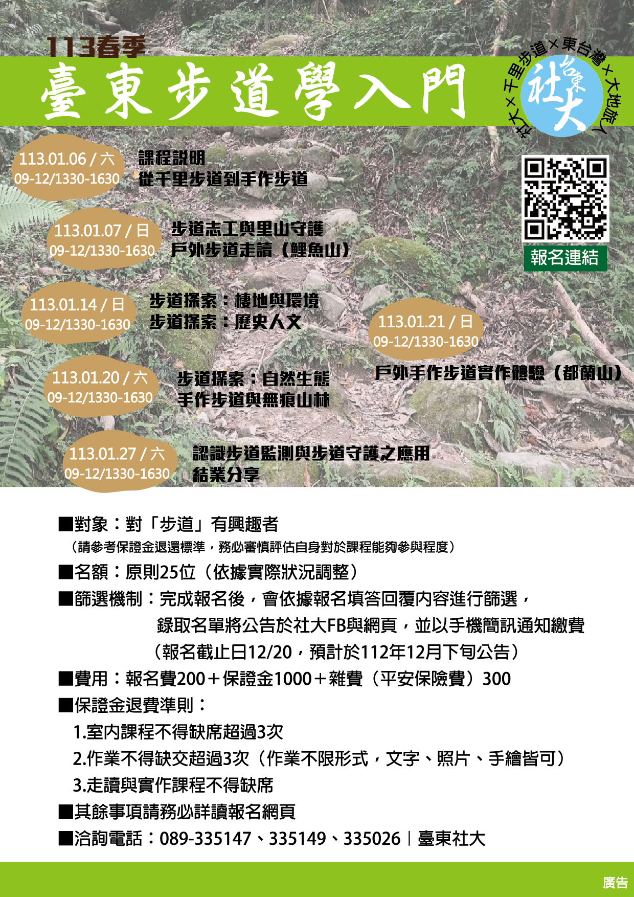 - 課程費用:報名費(社大舊生100元、新生200元)、保證金1,000元、雜費300元。