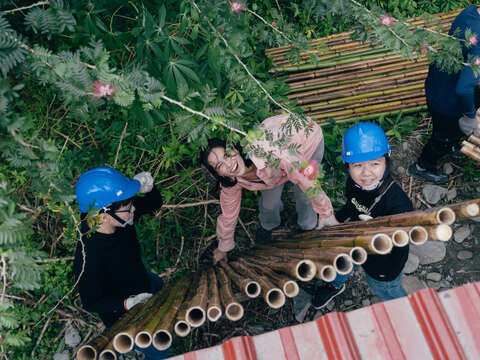 「搭建苧麻染織工寮」是今年部落學習工作營的主軸,志工們從上山採竹開始,學習鋸竹、砌石技能,與在地青年、工匠們同心協力打造一處可以展示、儲放苧麻的空間外,也希望能在這裡推動處理苧麻纖維的工序、織布等重要工項,更期待在未來,這一座染織工寮能成為學習與傳承染織文化與知識的重要基地。此次搭建的工寮形式並非部落過去的傳統樣貌,而是使用現代工法打造,就像當代青年轉譯古老文化般,用當今的建築方式構築一處傳承文化知識的場域。