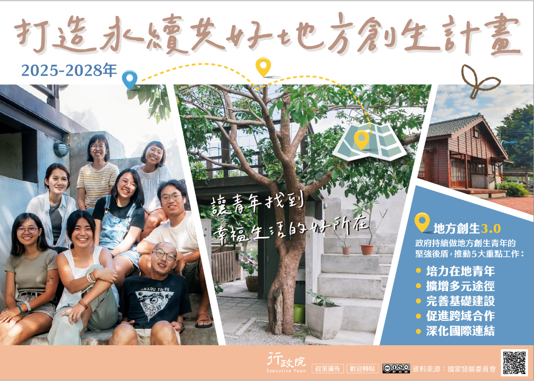 訊息內容為促進臺灣城鄉聚落均衡發展,政府將自114年起,推動「打造永續共好地方創生計畫(地方創生3.0)」,帶動地方復興,吸引更多青年返鄉、留鄉,行政院特策製旨揭說明資料。詳細資訊可至🔗行政院全球資訊網 👈查詢。 相關連結行政院全球資訊網行政院全球資訊網>政策與計畫>政策櫥窗相關照片