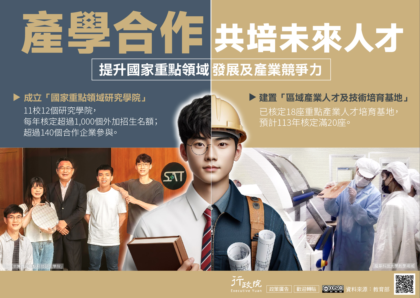 訊息內容為提升國家重點領域發展及產業競爭力,政府公布《國家重點領域產學合作及人才培育創新條例》,並協助成立「國家重點領域學院」與建置「區域產業人才及技術培育基地」,培養未來人才。行政院特策製旨揭說明資料,歡迎民眾踴躍瀏覽或轉貼分享😉。 相關照片