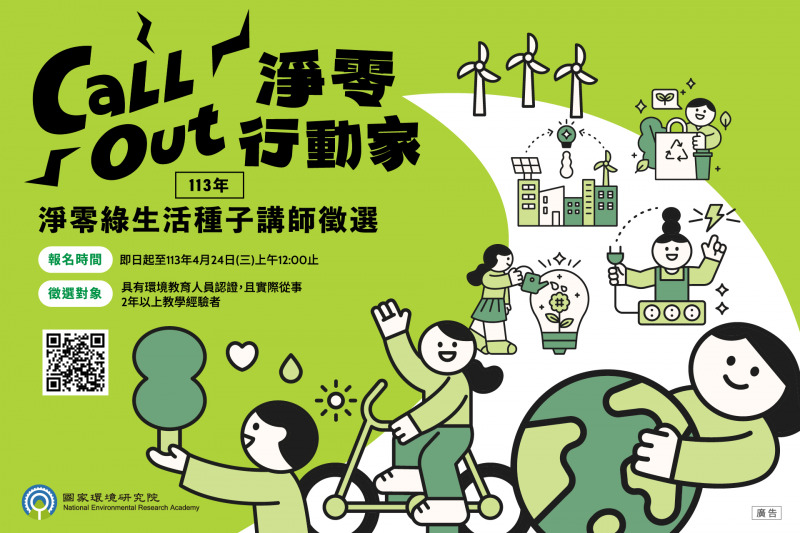 國家環境研究院為推展淨零綠生活環境教育,即日起開放推薦報名至113年4月24日(星期三),歡迎對於淨零綠生活環境教育具有推廣熱忱、影響力及教學力,且具有環境教育人員認證資格,實際從事環境教育教學推廣2年以上經驗者報名參加,獲選者將取得「淨零綠生活推廣種子講師證」,且公布環境教育教學專長資訊於「環境教育人才庫」網頁,提供社會各界查詢運用。