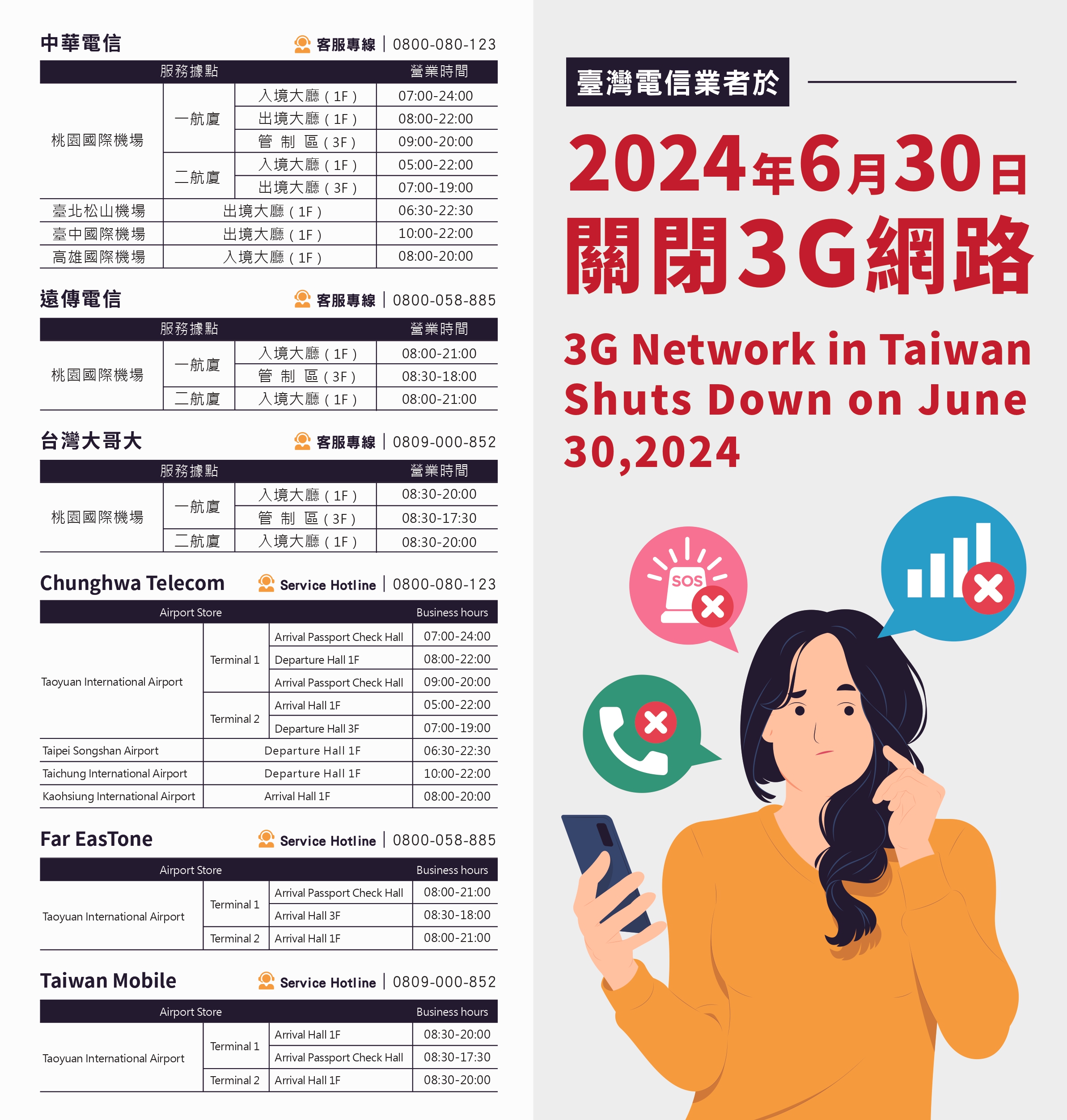 臺灣電信業者於2024年6月30日關閉3G網路