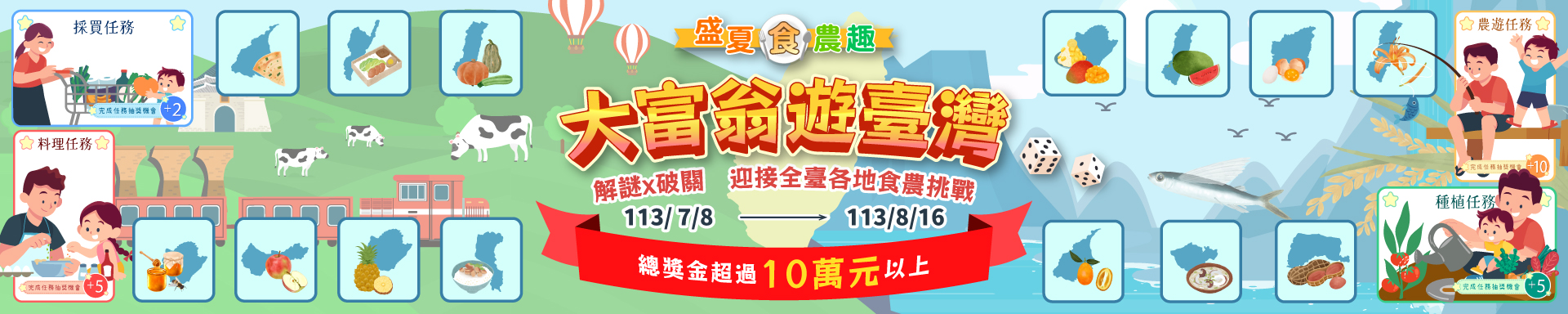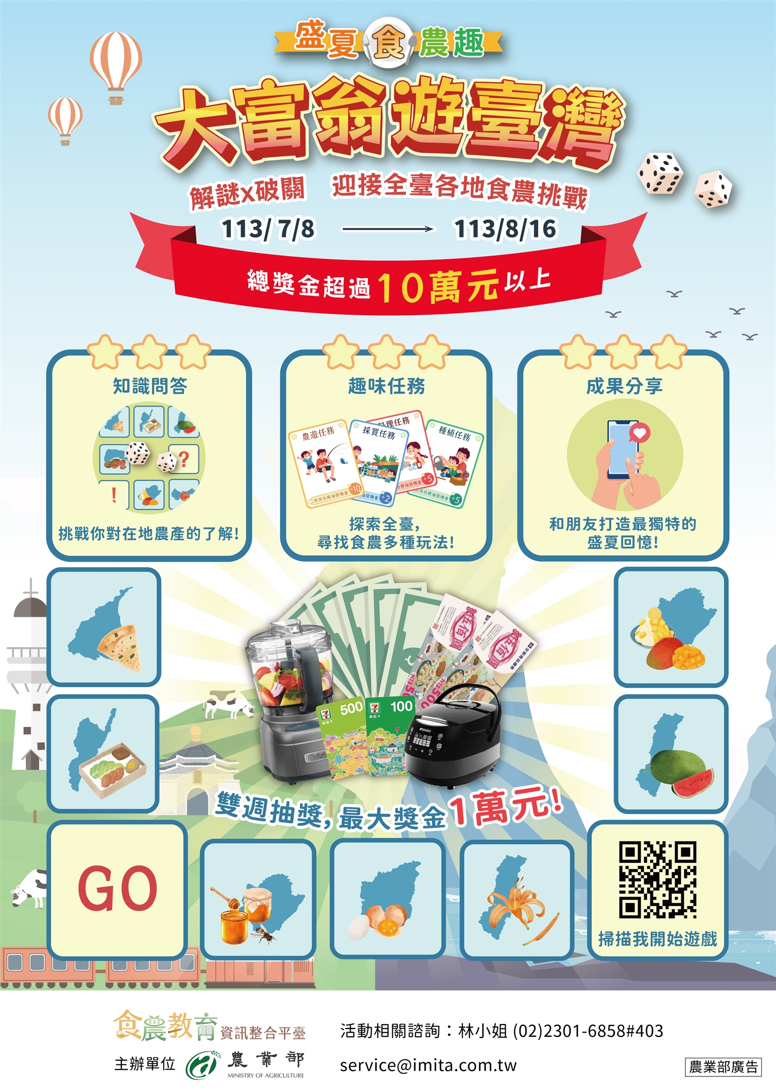 訊息內容 為強化食農教育素養,並促使大眾更加了解食農教育,農業部應用「食農教育資訊整合平臺」,並訂於113年7月8日至8月16日舉辦「盛夏食農趣:大富翁遊臺灣」食農教育推廣活動(活動網頁👈請點我 ),提供食農教育相關知識問答、任務體驗與成果分享等遊戲,參與活動即可抽獎活動,總獎金超過10萬元,活動報名人員須具中華民國國籍,並於網站會員專區完成電子郵件信箱驗證後,始得成為食農教育資訊整合平臺會員及參加本活動。😉 相關照片