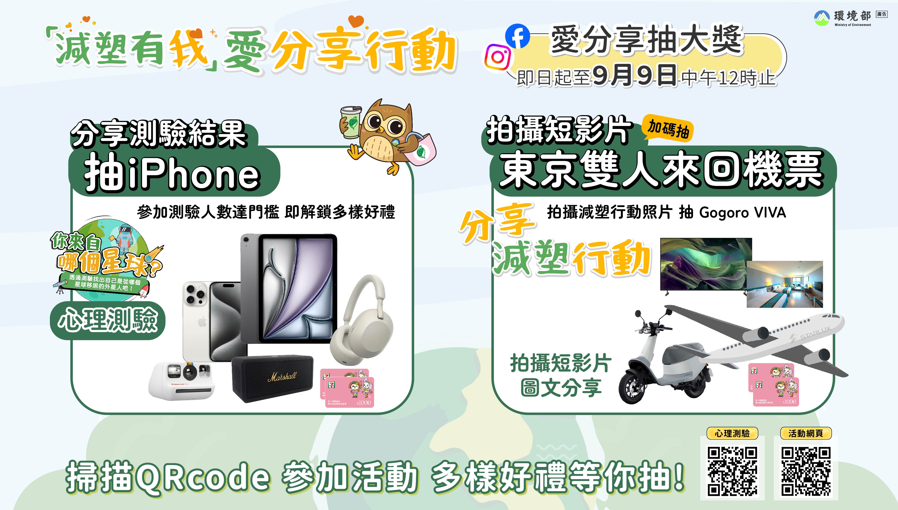 訊息內容為鼓勵社會大眾及莘莘學子在暑期假期間一起跟上全球減少塑膠的風潮,環境部特別辦理「減塑有我」愛分享行動,可透過臉書(Facebook)、Instagram(IG)等社群媒體,拍攝個人生活中減塑短影片、減塑生活照片,並可透過參加心理測驗遊戲,瞭解並發覺屬於自己獨特的環保行動,參加旨揭活動拿大獎。 本活動自已於113年9月9日中午12時截止。相關連結環境部 全球資訊網相關照片